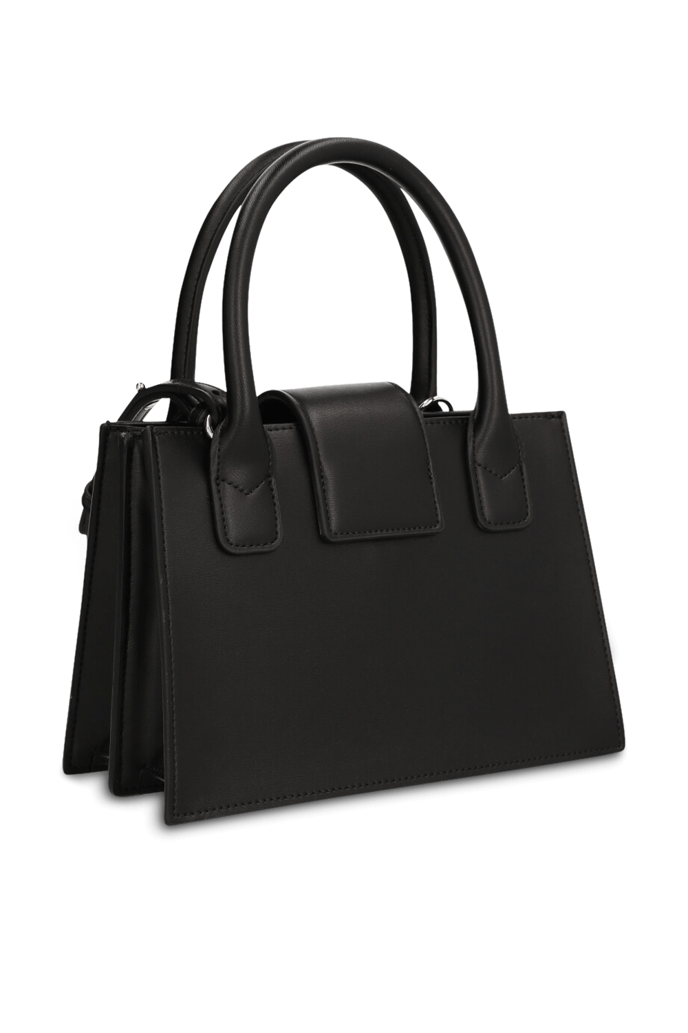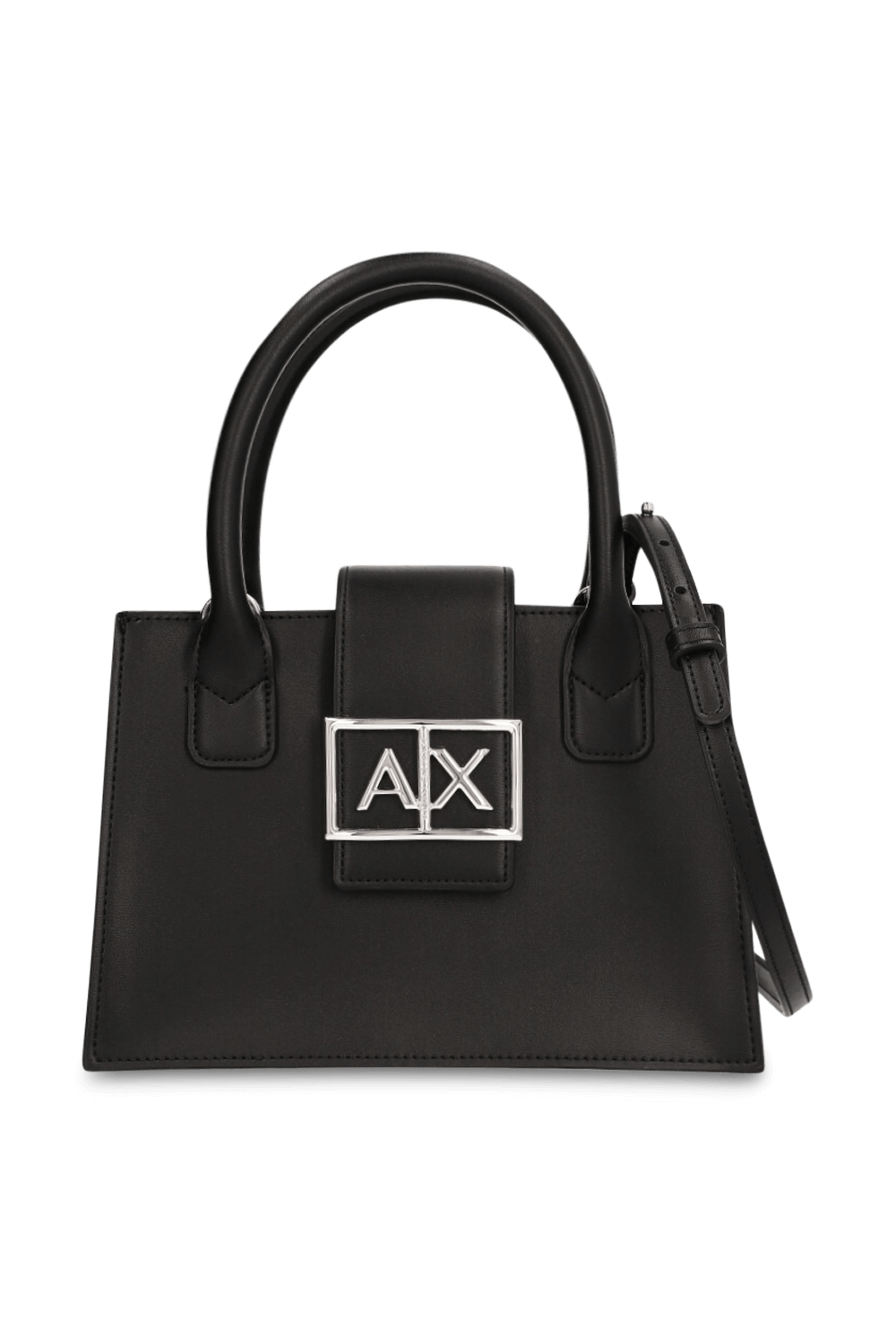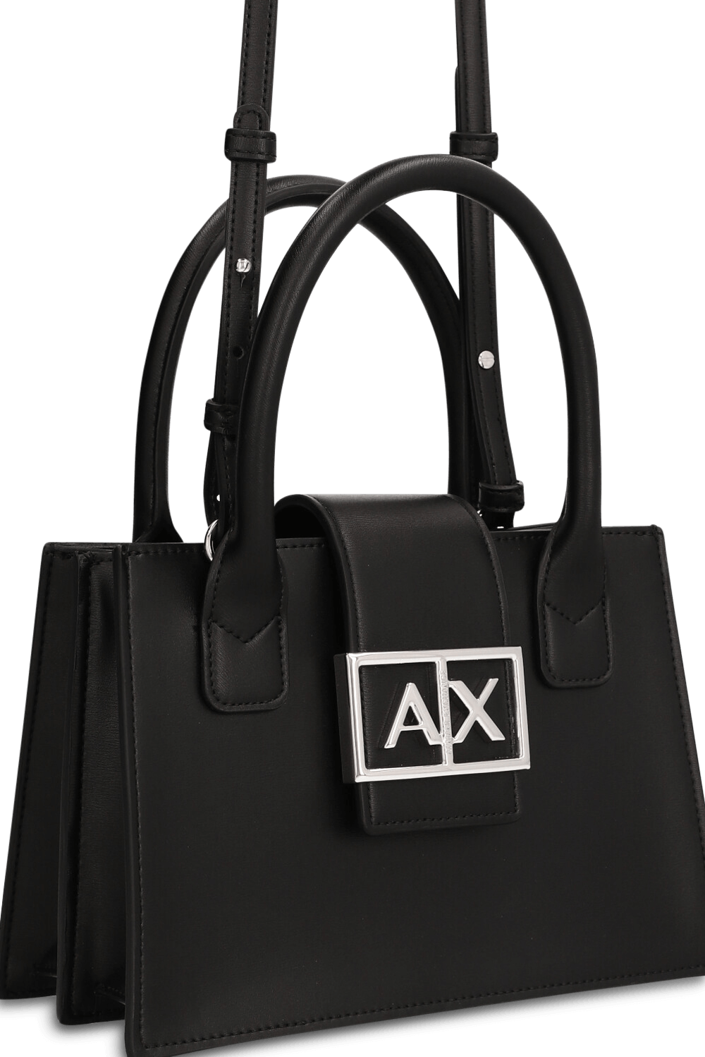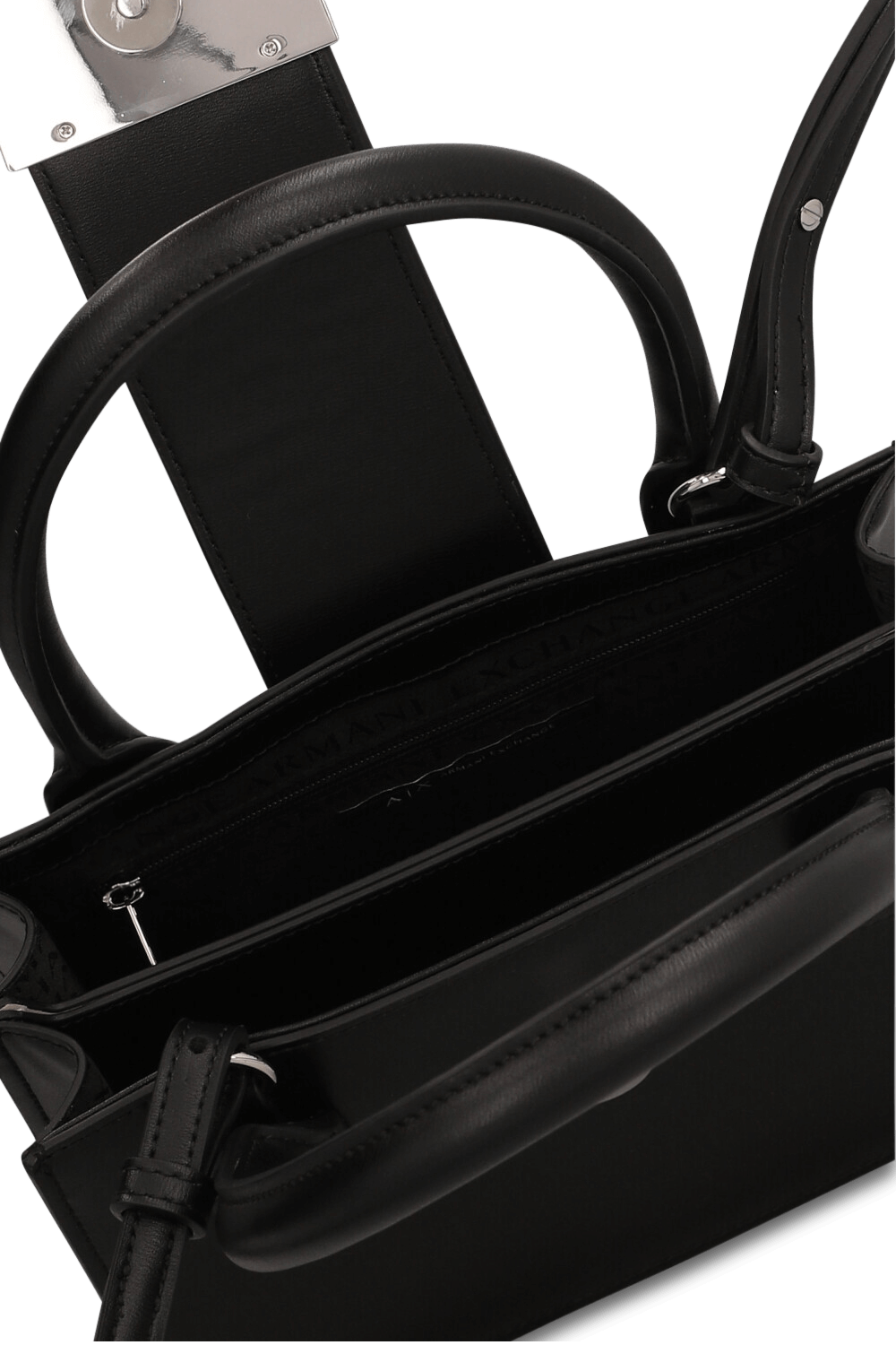 תיק טרפז בגודל סמול מבית Armani Exchange, עשוי עור טבעוני בצבע שחור. יש לו תא איחסון מרכזי עם כיס פנימי והוא נסגר במגנט. מגיע עם זוג ידיות אחיזה ורצועת נשיאה הניתנת להסרה.