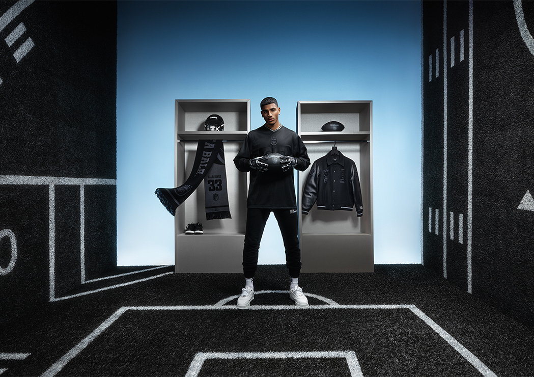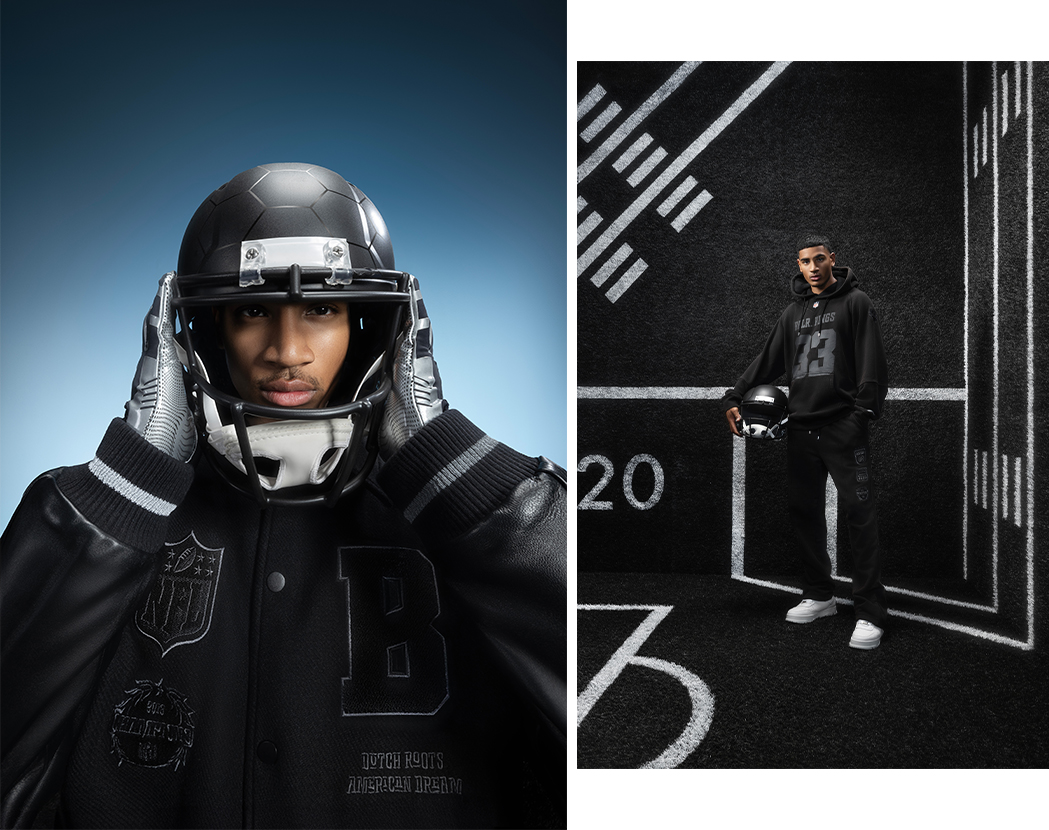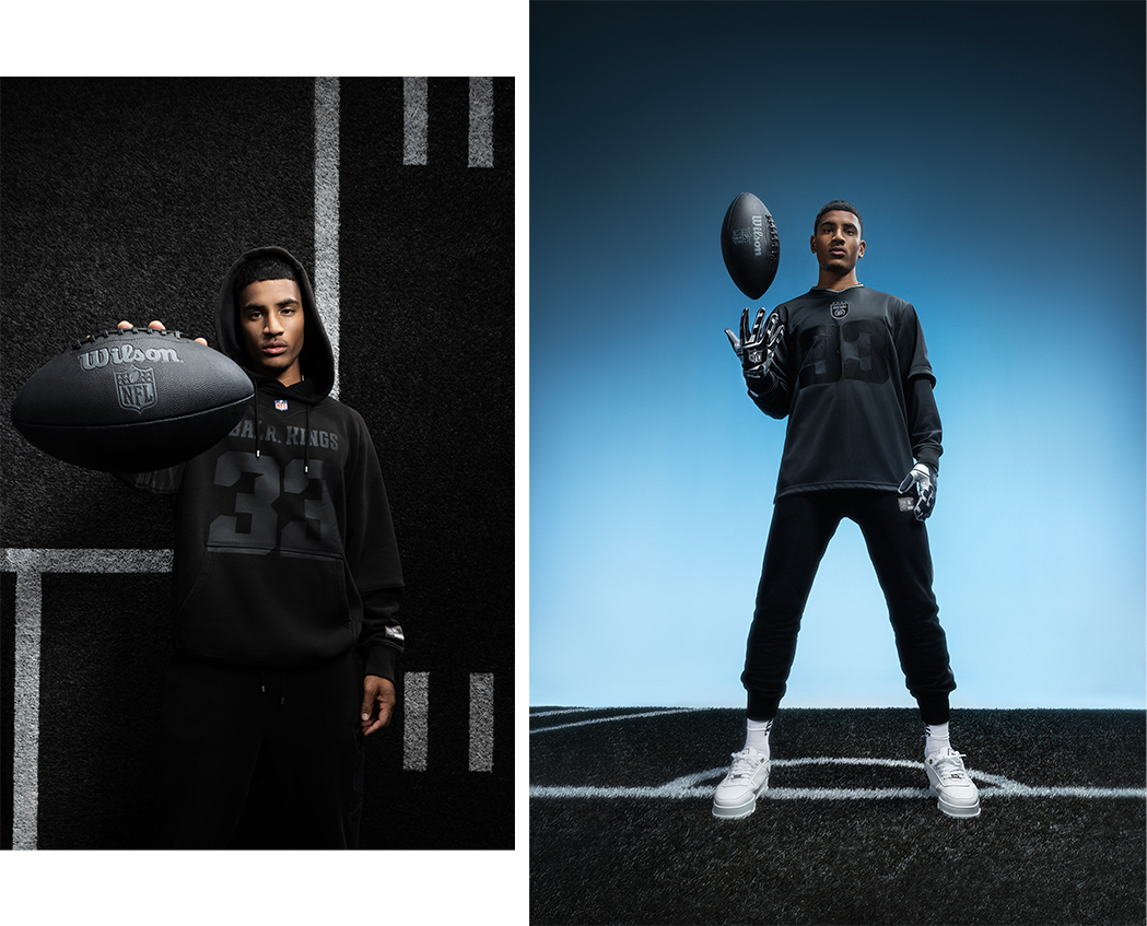 כל הפריטים מבוססים על צבעי שחור ואפור, ומיוצרים מטקסטילים איכותיים. המיתוג לקולקציה המשותפת נטמע על הדגמים במראה של טון על טון, עם לוגואים רקומים או מודפסים, המציגים אלמנטים מעולם הפוטבול האמריקאי - כמו מגן ה-NFL האייקוני, תגי הקפטן והמספר 33.