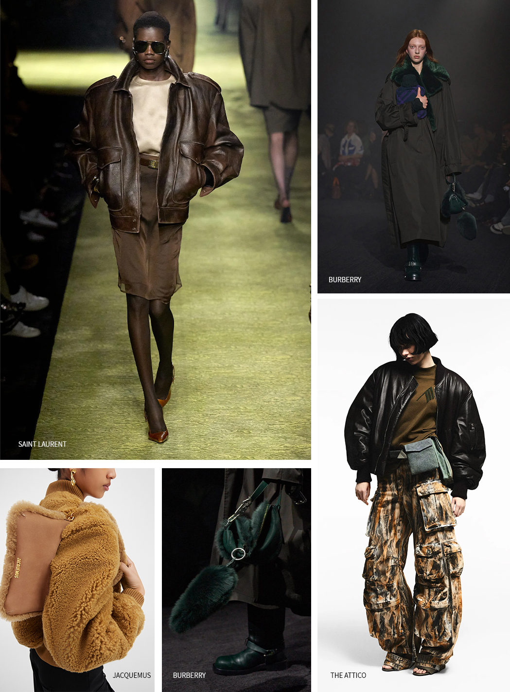 מכנסי דגמ"ח הינם קטגוריה בולטת נוספת בקולקציות של המותגים המובילים, וניתן למצוא מגוון גרסאות מוצלחות של OFF WHITE ו- THE ATTICO בין היתר. גם פיסים מעור מהווים חלק חשוב באוספים החדשים, אל תפספסו את הקרופ טופ השחור מבית LOEWE או את המעיל בטקסטורת כיווצים של GANNI.