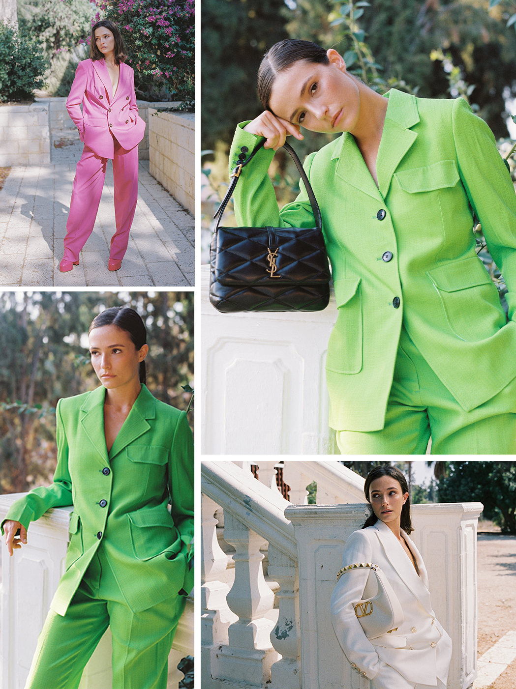 עבור מי שמעוניינת להתרחק קצת מהקונספט הלבן, נמליץ לשים לב לשניים מהגוונים המדוברים של העונה: ורוד וירוק. ליהי מצולמת בחליפה ורודה סגלגלה בעיצוב המותג DSQUARED2. הלוק מורכב מחליפת מכנסיים בצללית קלאסית, לה הותאמו עקבי פלטפורמה מסדרת TAN-GO ותיק כתף עם אבזם לוגו משובץ אבנים, שניהם בעיצוב VALENTINO.