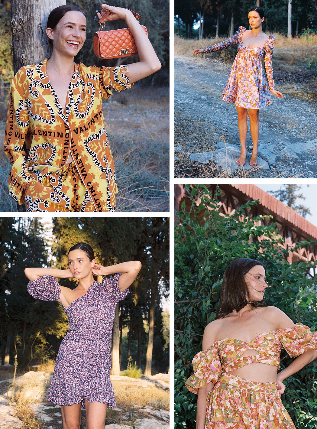 בתמונה הראשונה לובשת השחקנית שמלה פרחונית בצללית בייבי דול מבית ZIMMERMANN. השמלה באורך הברך מציגה שרוולי פאף ארוכים בשילוב מחשוף מכווץ, ולצדה נבחר לככב התיק האייקוני לה צ'יקיטו של JACQUEMUS בגוון סגול פסטלי. בוהו-שיק רומנטי נוסף מבית ZIMMERMANN מציג סט פרחוני המורכב מטופ קרופי בעל אלמנטים של קאט-אאוט ושרוולים נפוחים חושפי כתפיים, בשילוב חצאית מידי בבצללית אוורירית. את הלוק חותמים סנדלי עור שחורים בליפוף שרשרת מתכת זהובה מבית המותג BOTTEGA VENETA.