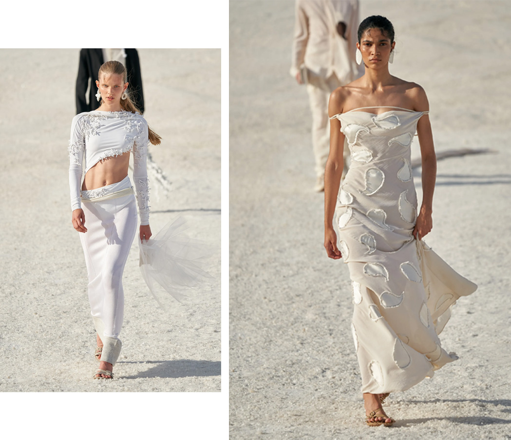 המסלול הלבן והחצוב שהתפתל במורד צלע הגבעה עליו צעדו הדוגמניות, מוקם בין הרי המלח ויצר מראה של אזור נחיתה על הירח. לאחר דואט מחול בו נראו צמד דוגמנים חבוקים, פתחה את התצוגה הדוגמנית הישראלית (והפרזנטורית שלנו) סאן מזרחי, כשהיא לובשת מכנסיים לבנים בצללית גבוהה לצד טופ מחוכי עם שולי בד ארוכים שהתעופפו לאחור במראה של צעיף טול כלתי.