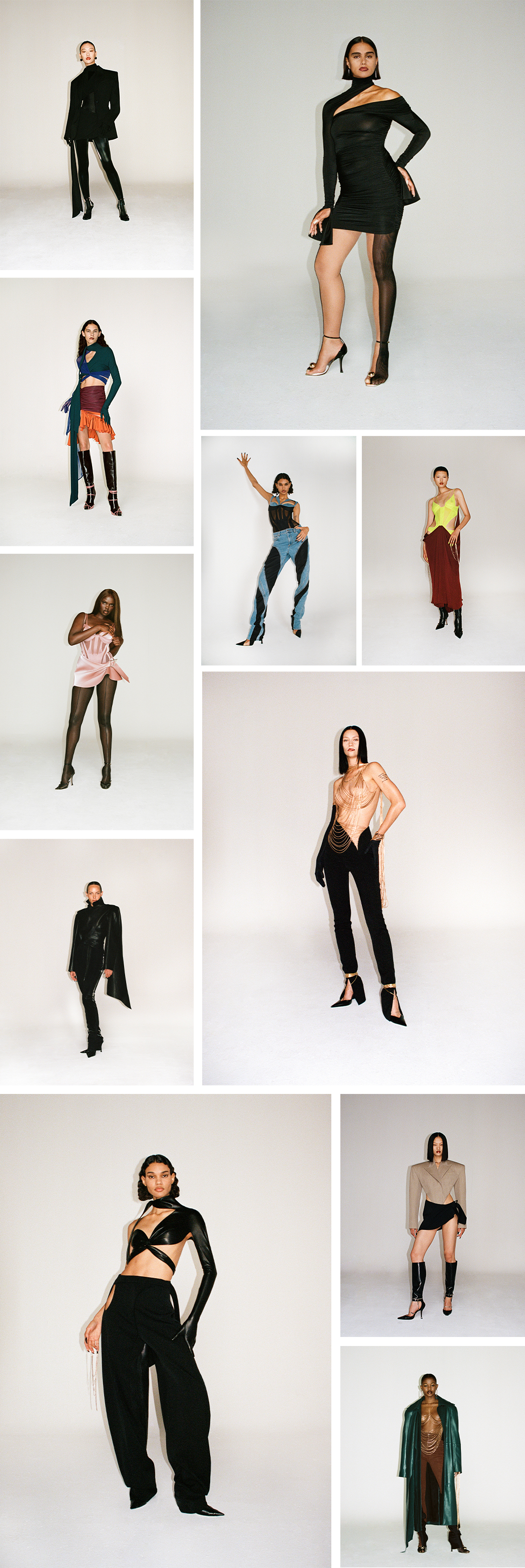 הקולקציה החדשה של מוגלר, שנחתה בפקטורי 54, ממשיכה לחגוג את הגזרה הנשית בכל תפארתה. צלליות צמודות וחובקות גוף, קונסטרוקציות גיאומטריות, משחקי טקסטורה ושקיפויות, ופתחי קאט-אאוט במיקומים אסטרטגיים מכתיבים את הקו העיצובי הנחשק. סגנונו הסקסי של המותג נשען בעבר בעיקר על פלטת הגוונים הכהים והשחורים, אך כעת הוא מתרחב לצבעים חזקים ובוהקים כמו צהוב ניאון, כתום, ירוק ואפילו גוון ורוד זוהר בחושך. בין הפריטים הבולטים בקולקציה: שמלות מיני ובגדי גוף סקסיים בגזרות ייחודיות, פריטי עור נועזים, בלייזרים מחויטים עם כתפיים מודגשות, מכנסי ג׳ינס בשילוב טקסטורות ומגוון מכנסי טייץ סופר מחמיאים.