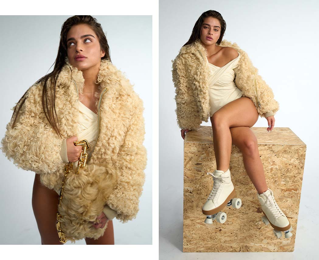 שרלינג הוא אחד הטרנדים הבולטים העונה, ובהפקה הוא מובא לידי ביטוי במעיל הצמרירי של בית האופנה BOTTEGA VENETA. המעיל השתלב עם תיק ה-POUCH האייקוני של המותג, בעל רצועת הצ'אנקי המוזהבת, שלכבוד החורף הקרוב מגיע בגרסת שרלינג פרוותית. ה-שוס האמיתי של הלוק הוא תוספת הגלגיליות תוצרת בית האופנה האיטלקי, אקססורי מפתיע ושובב שחותם את הלוק בסטייל.