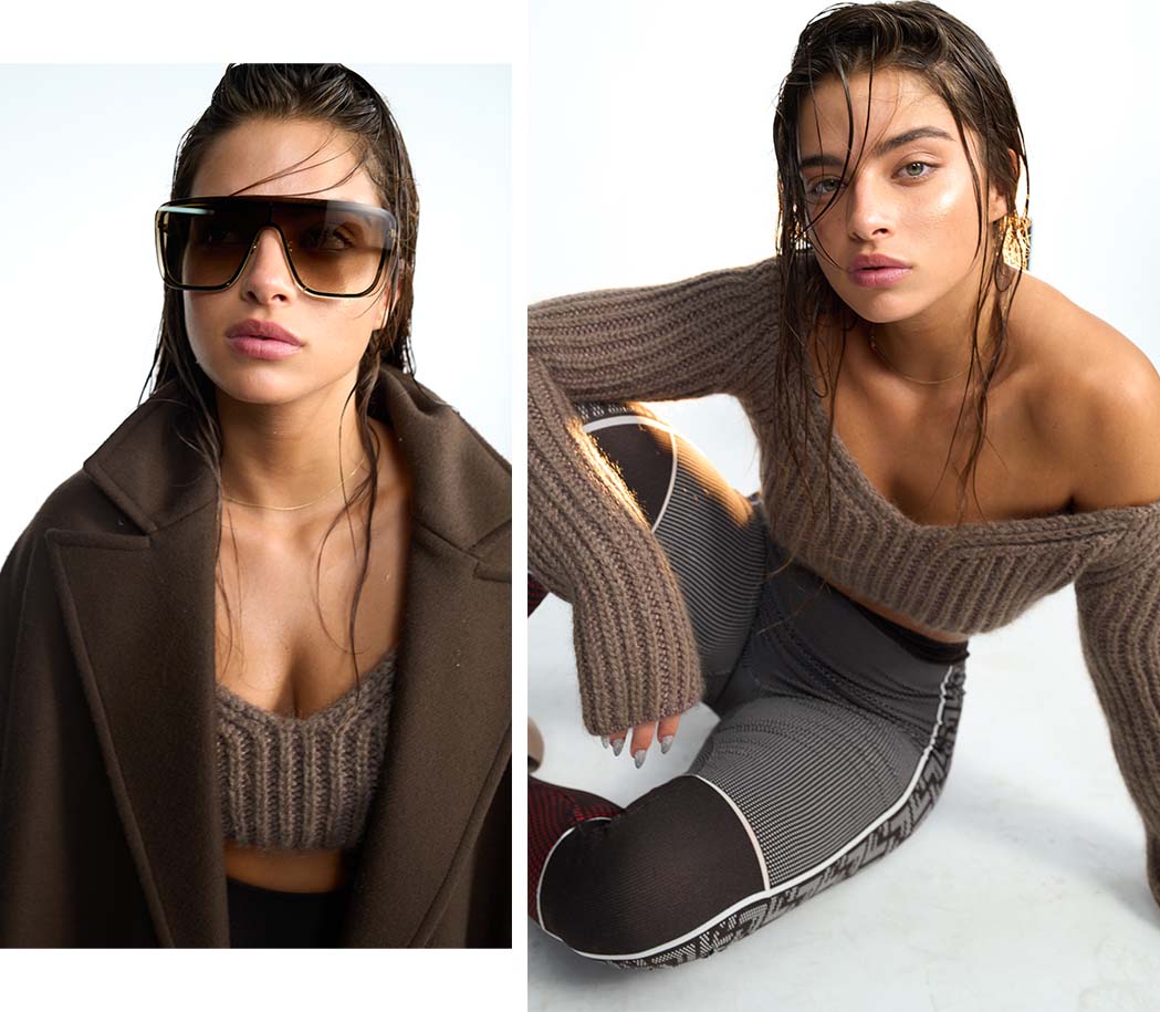 הלוק האחרון בסדרה כולל טופ צמר חושף כתפיים בעיצוב בית האופנה FENDI, ששולב עם טייץ המציג פרשנות חדשה למונוגרמת המותג. מעליו לבשה נועה מעיל צמר בגוון החום הנכון ובאורך מקסי של THE ATTICO. את הווייב הקרדשיאני חתמו משקפי שמש מבית SAINT LAURENT.