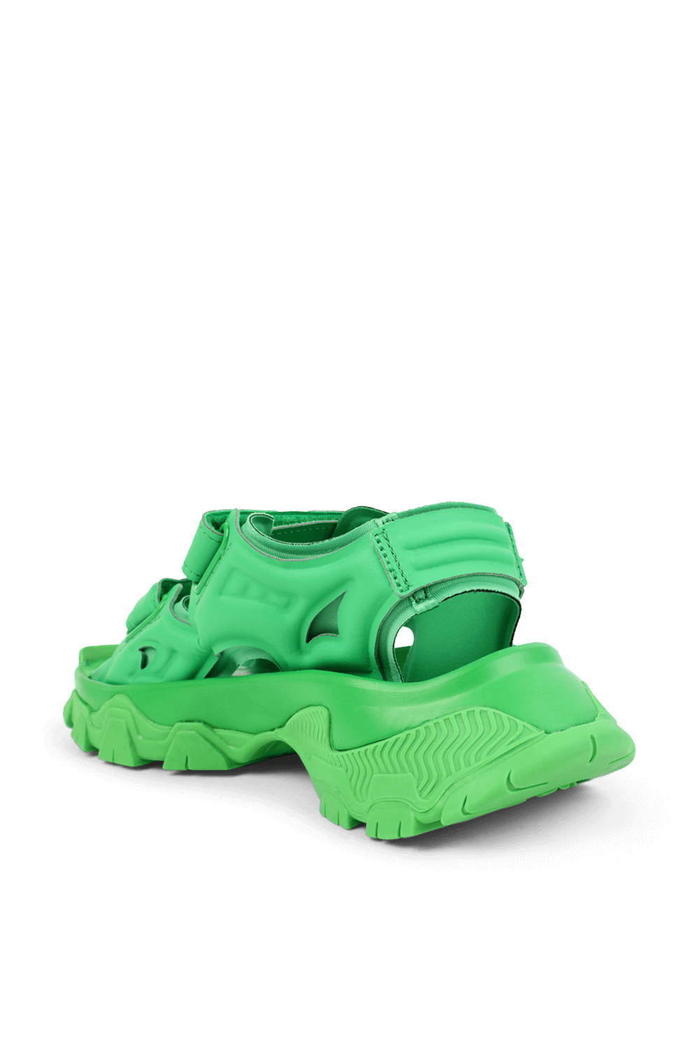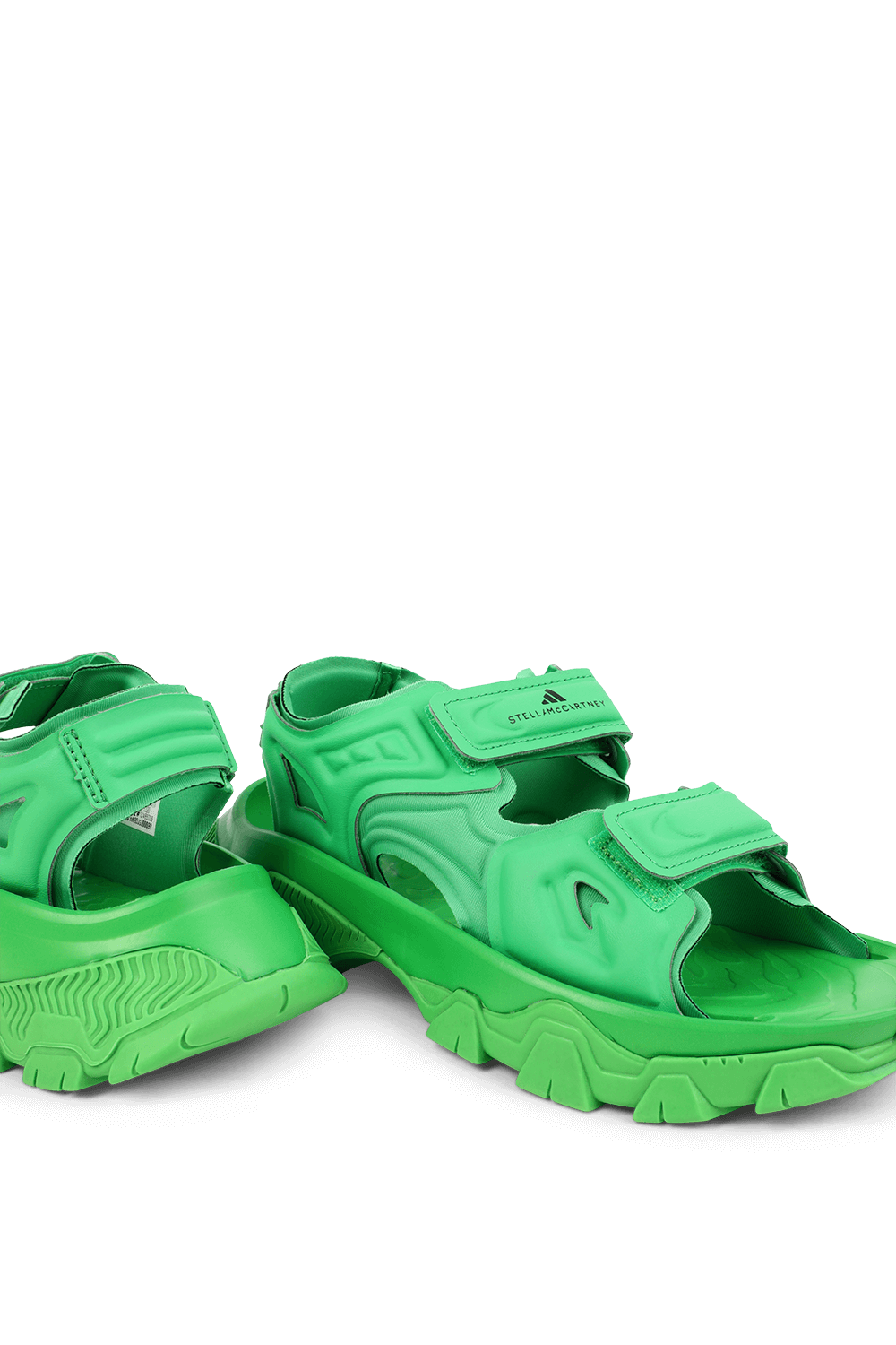 סנדלי טיולים מתוך שיתוף הפעולה בין Adidas לבין Stella Mccartney, בעיצוב צ`נאקי ובצבע ירוק, העשויים תערובת טקסטיל דמוי עור וכותנה אורגנית. לסנדלים סוליית ביניים מרופדת העשויה EVA, ורצועות עם סגירת סקוטש.