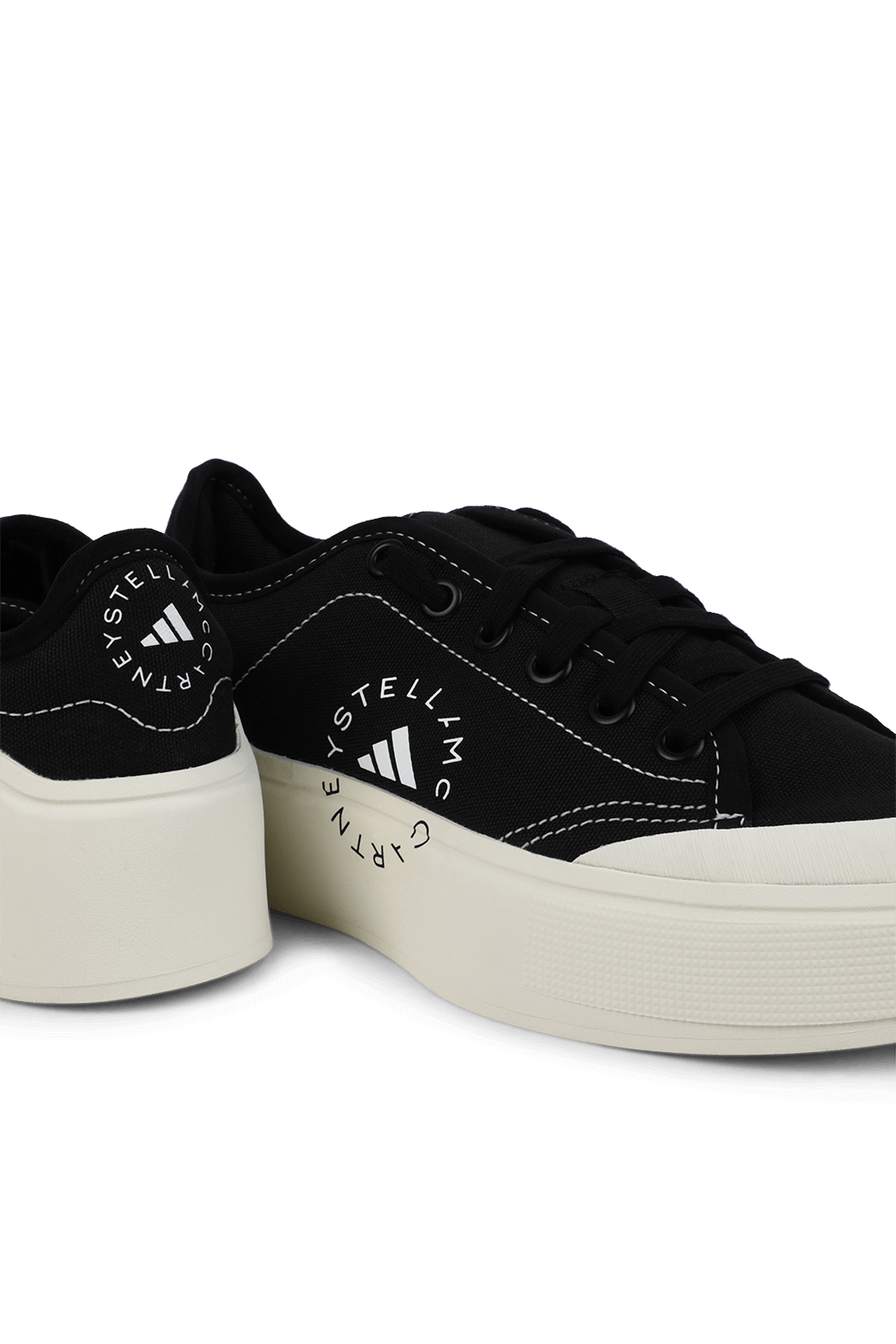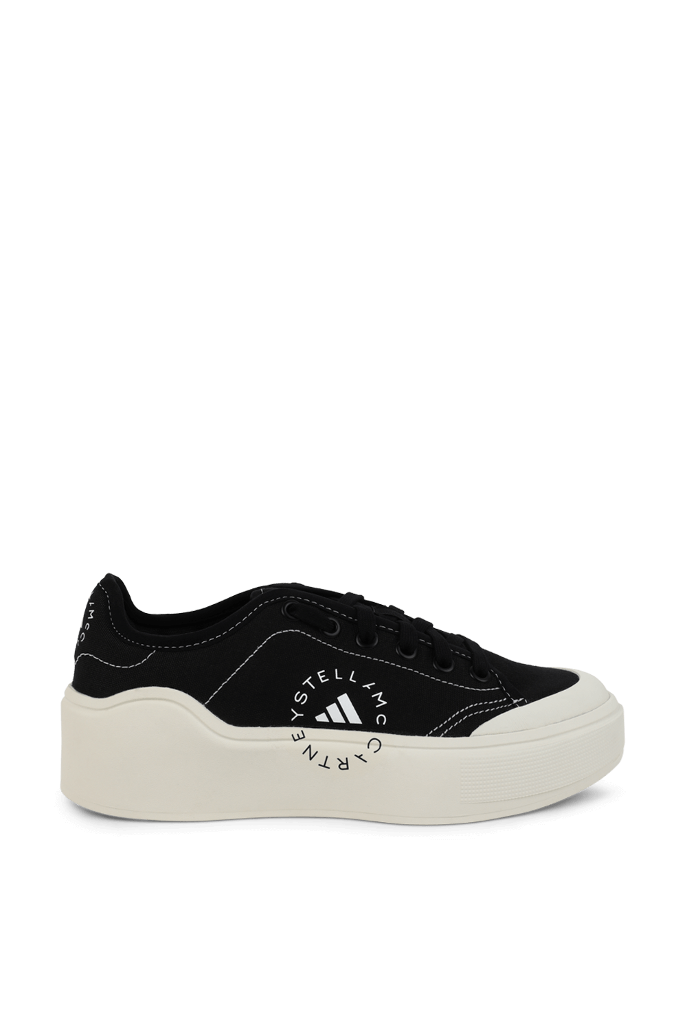 סניקרס מבית שיתוף הפעולה בין Adidas לבין Stella Mccartney, העשויות תערובת טקסטיל וכותנה אורגנית בצבע שחור עם סוליות פלטפורמה לבנות. לסניקרס תיפורים בולטים לבנים ושרוכי קשירה.