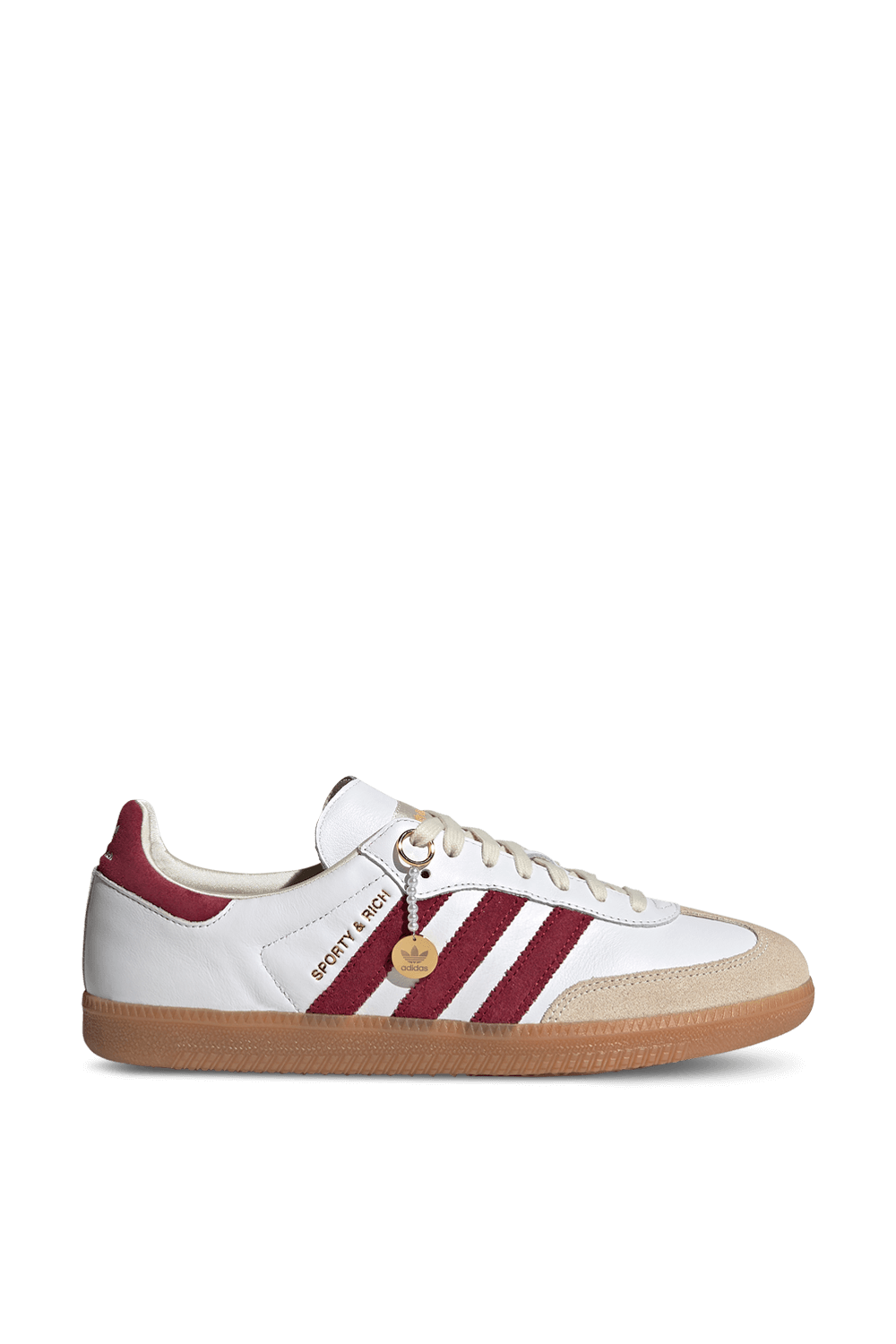 נעלי סניקרס מדגם Samba מתוך שיתוף הפעולה השלישי בין המותגים Adidas ל- Sporty And Rich. הנעליים עשויות עור עם בטנת סאטן וסוליית גומי בצבעי לבן, בז' ובורדו, בשילוב הטבעת המותגים בצדדים ובלשונית הנעל והן נשרכות ברכיסה נמוכה.
