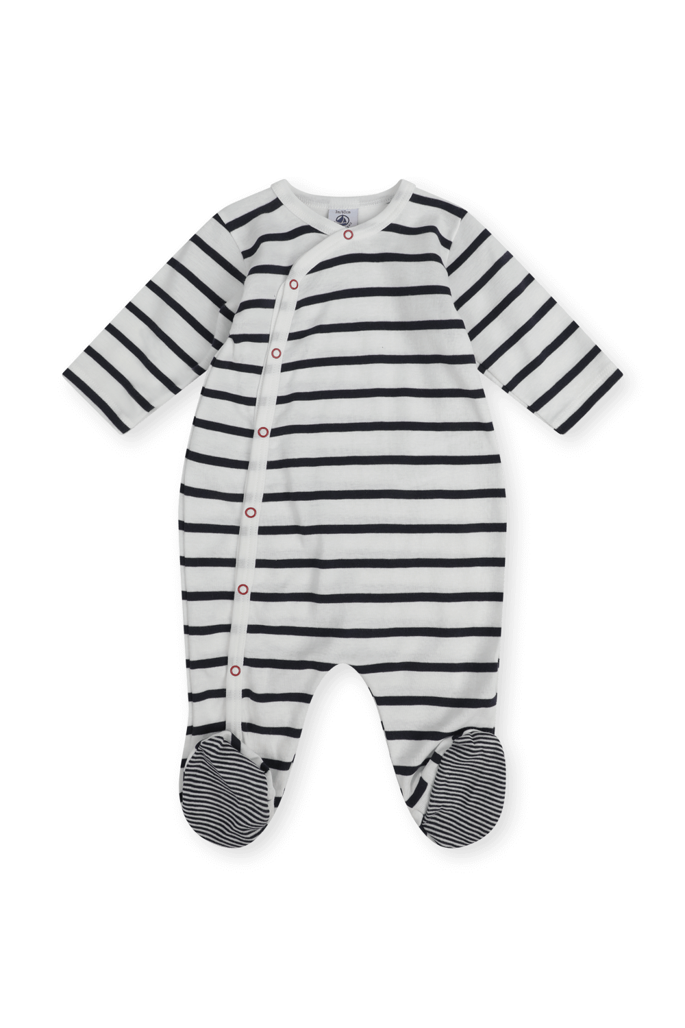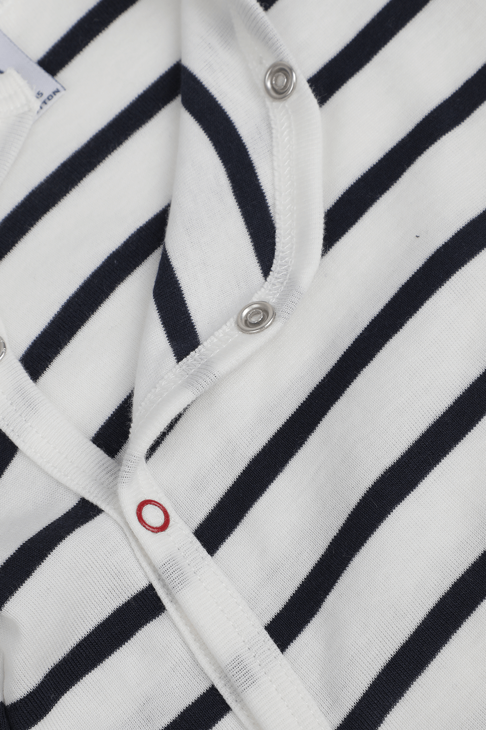 אוברול ארוך מבית Petit Bateau, עשוי כותנה רכה עם הדפס פסים בצבעי לבן וכחול נייבי. לאוברול סגירת כפתורי תיק תק אדומים מהצווארון ועד לסיומת ללבישה קלה ונוחה בתוספת רגליות השומרות על חום הגוף.
