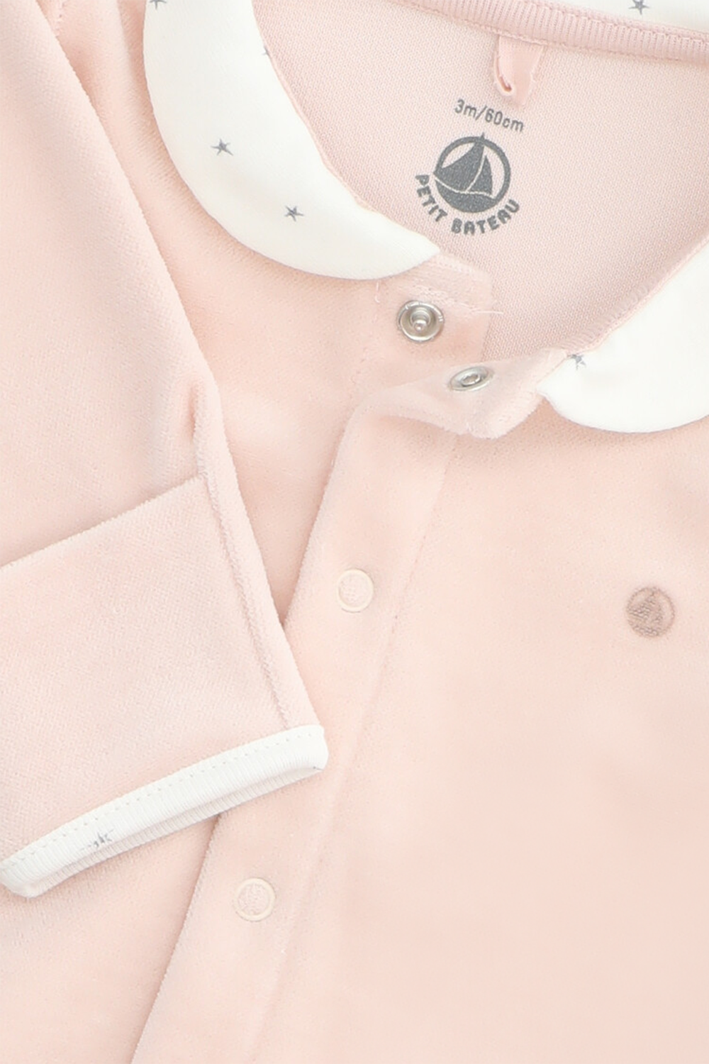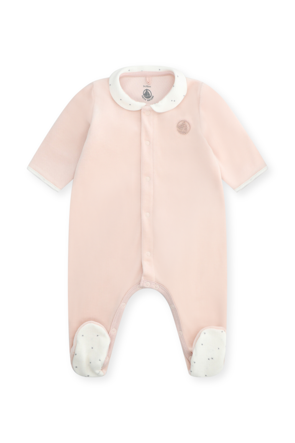 אוברול פיג`מה ארוך עם רגליות מבית Petit Bateau, עשוי כותנה אורגנית באריגת קטיפה בצבע ורוד עם דוגמאת כוכבים. לאוברול רוכסן מהצווארון ועד הסיומת להלבשה קלה ונוחה.