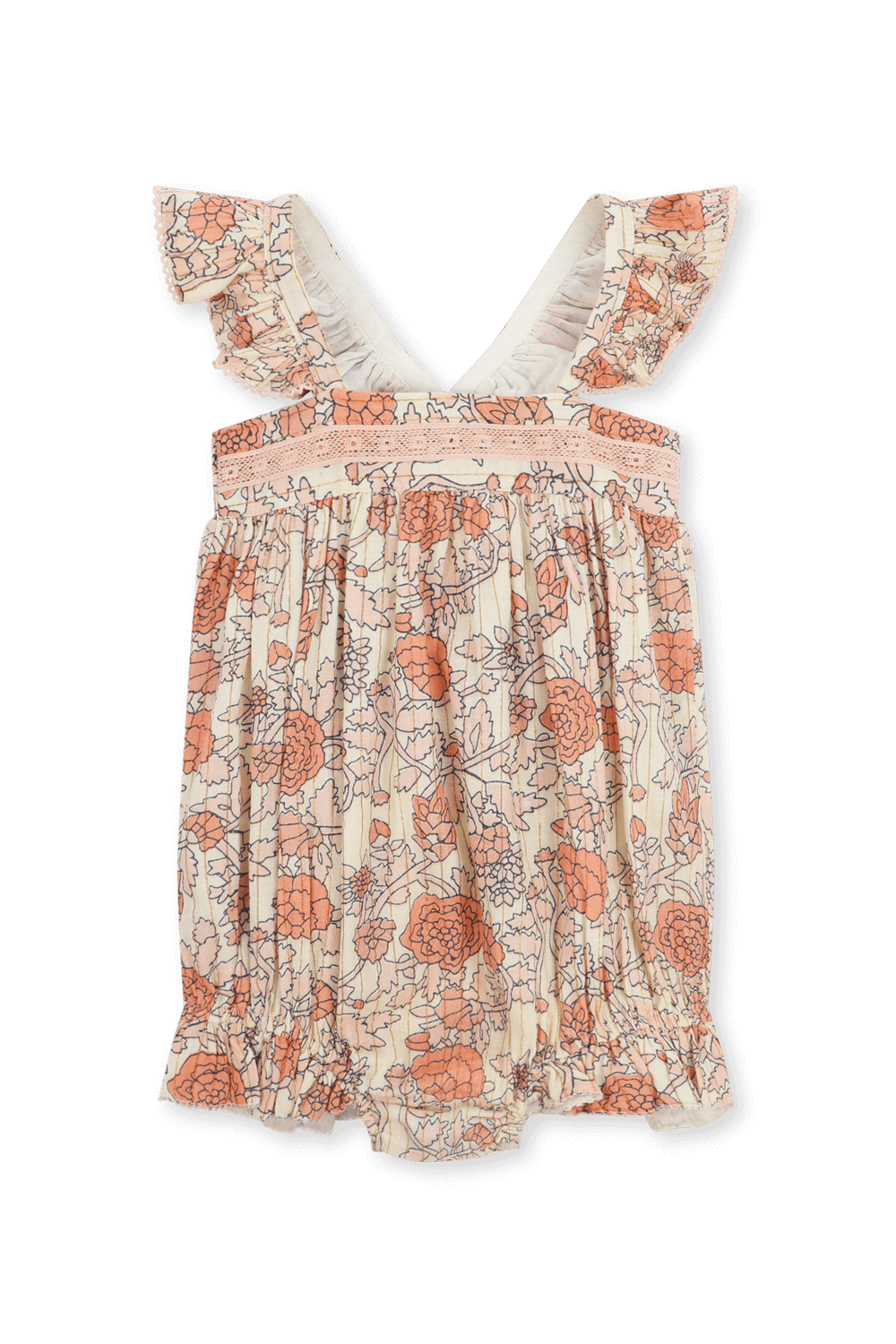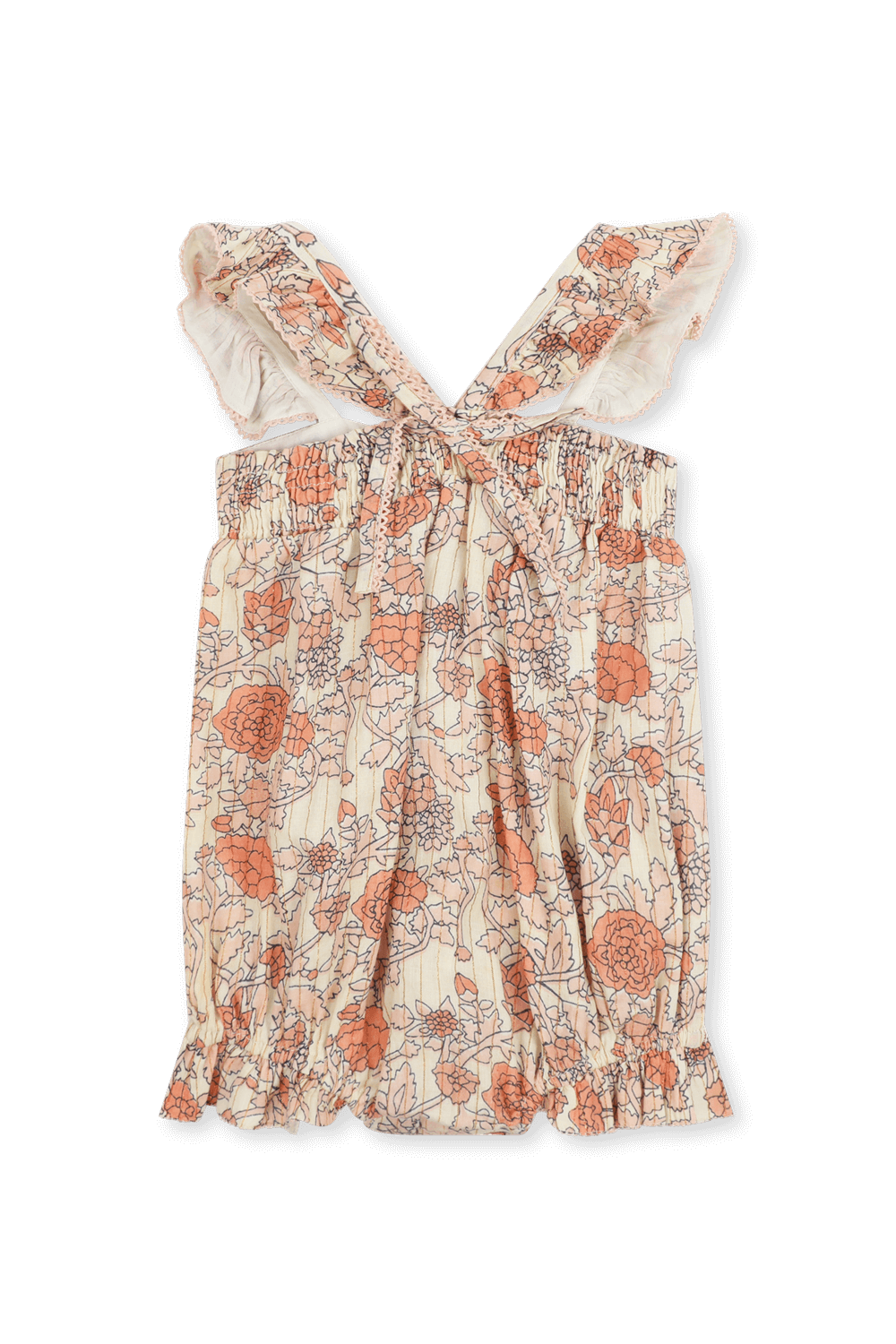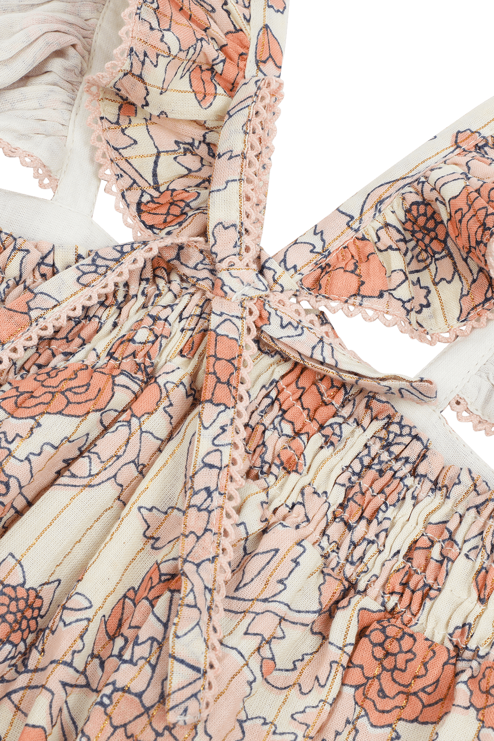 אוברול קצר מבית Louis Louise מדגם Marveille העשוי כותנה בהדפס פרחוני ורדרד עם פסי לורקס דקים בזהב. לאוברול כתפיות מלמלה המצטלבות בגב וכיווצים באמרות.