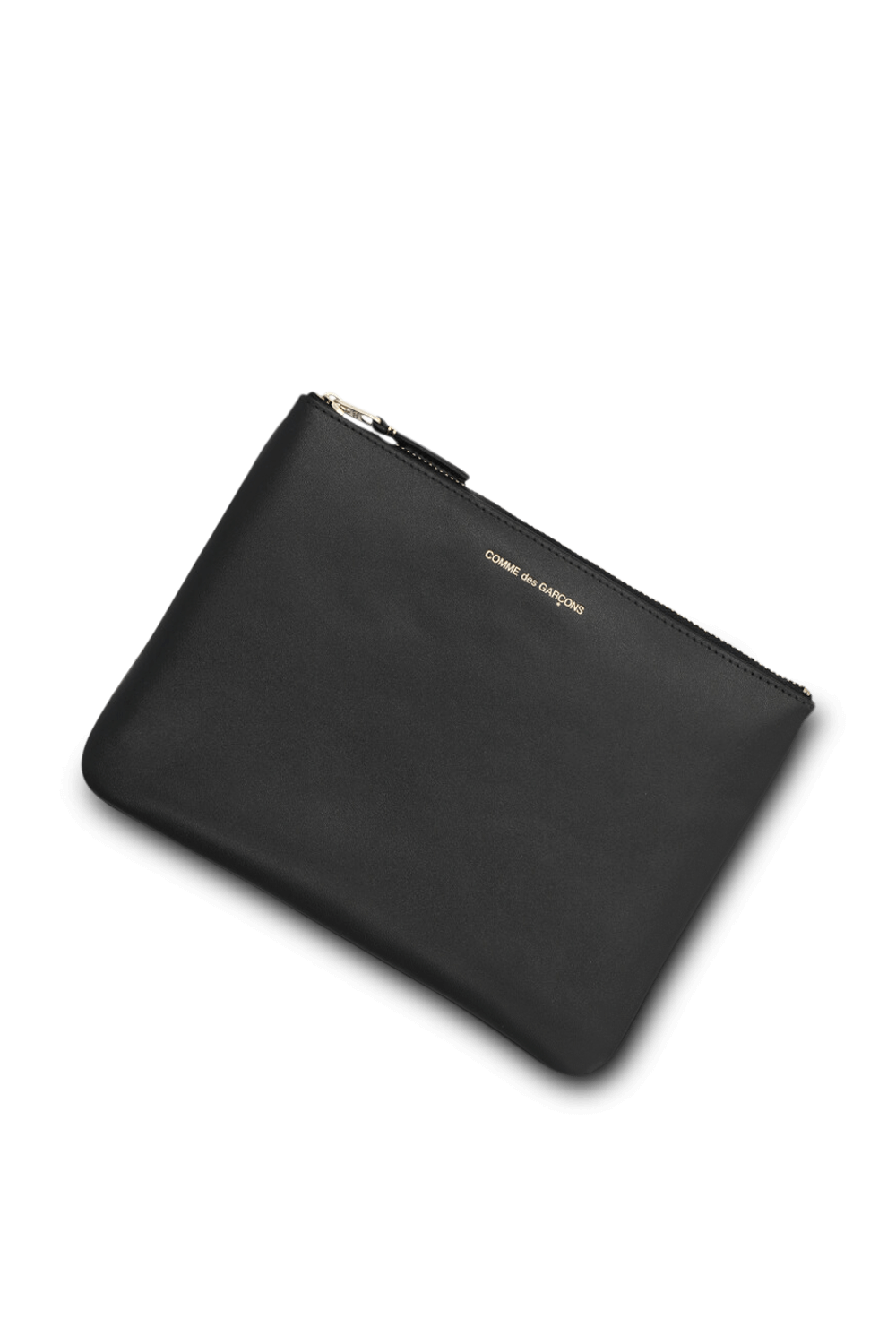 ארנק גדול ומרווח מבית Comme des Garcons, עשוי עור בצבע שחור עם ביטנת זמש ובסגירת רוכסן.