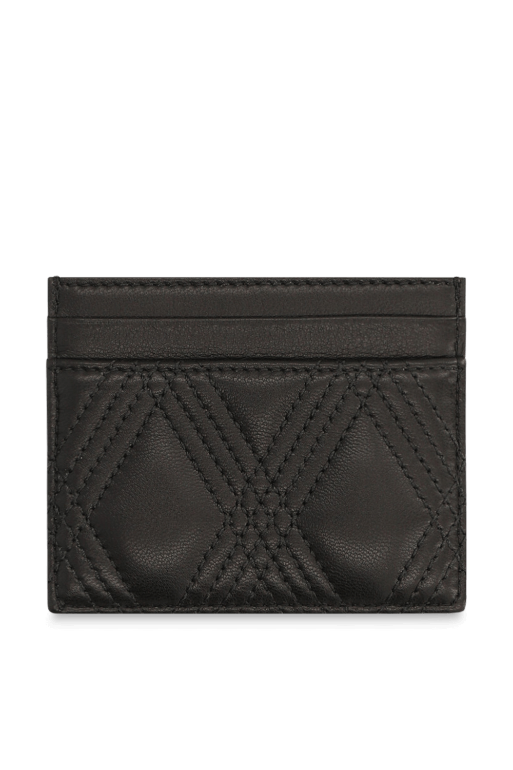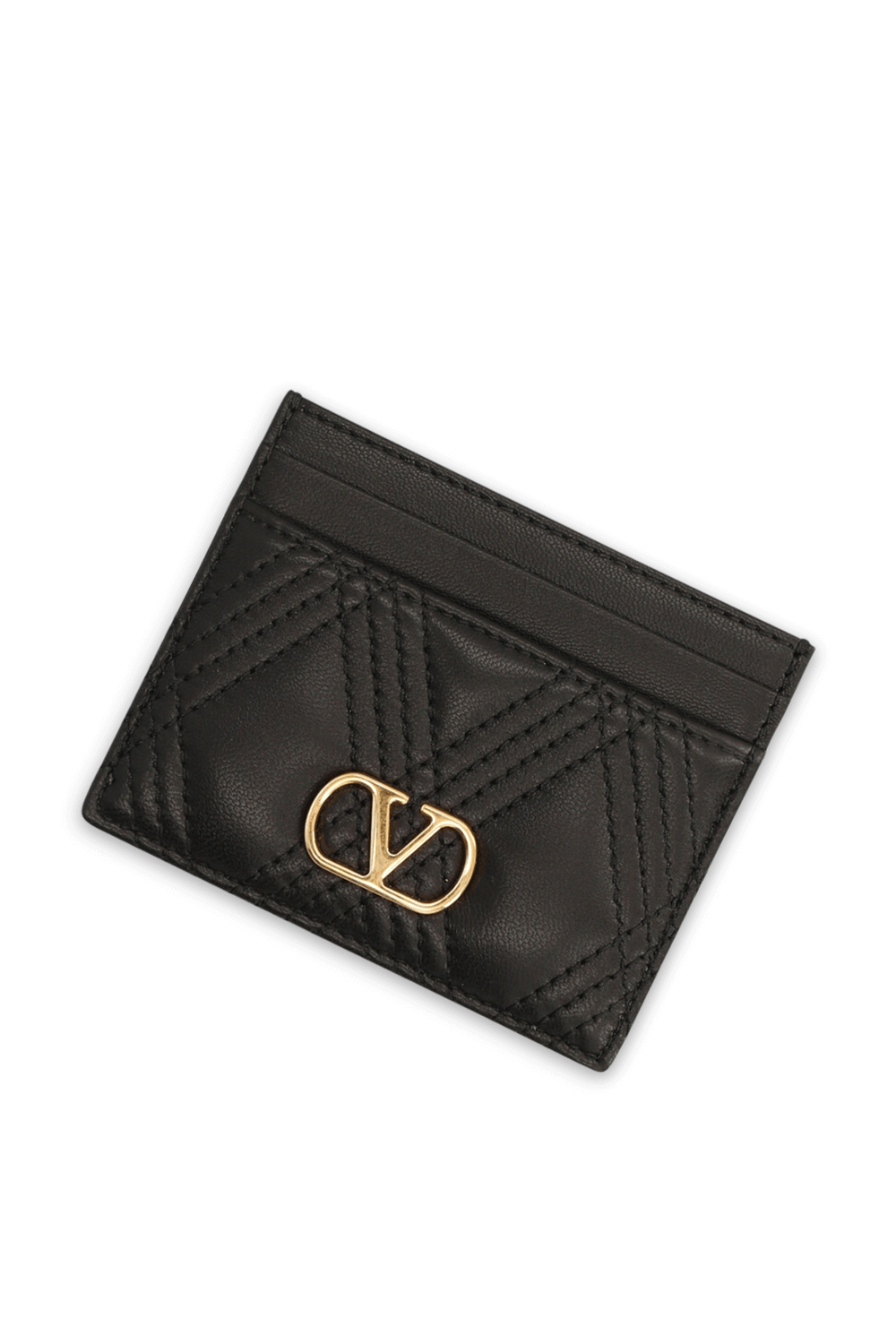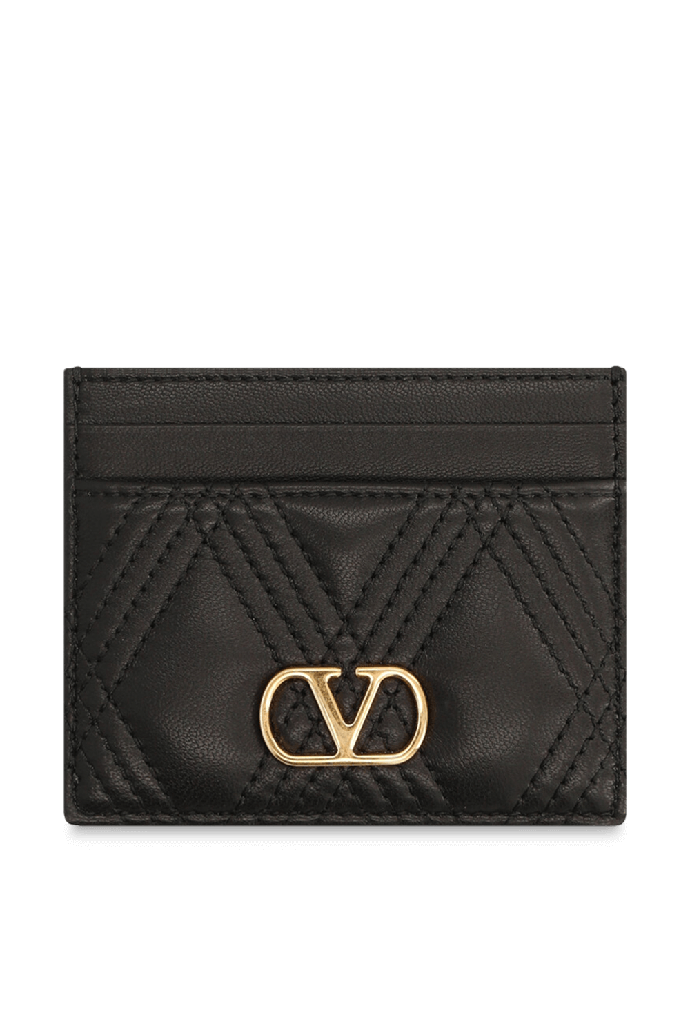 ארנק כרטיסים יוקרתי Quiltie 67 מבית Valentino, עשוי עור בצבע שחור, בעיצוב קווילט בדוגמת יהלום ותפרים בגוון תואם. יש לו ארבעה חריצים לכרטיסים ותא אמצעי לקבלות, עם לוגו בגימור פליז עתיק. מיוצר באיטליה.