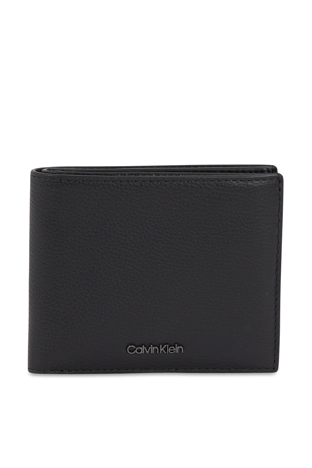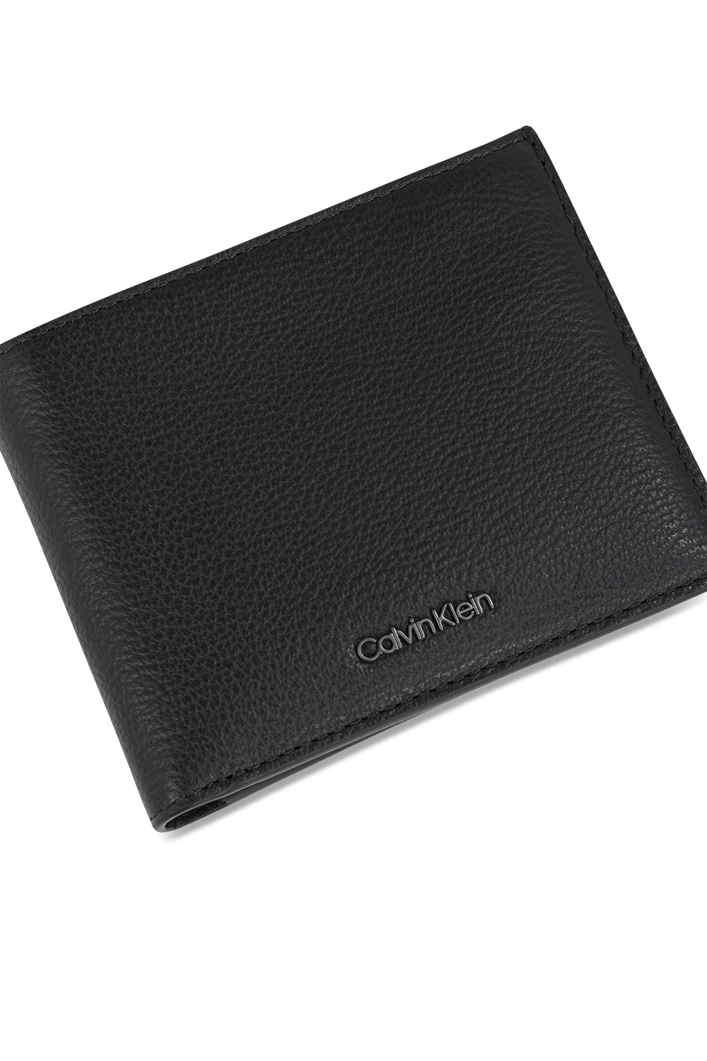 ארנק מבית Calvin Klein, עשוי עור מגורען בצבע שחור, יש לו חמישה חריצים לכרטיסים, שני תאי צד, תא רוחב לשטרות וכיס למטבעות הנסגר בכפתור תיק תק.