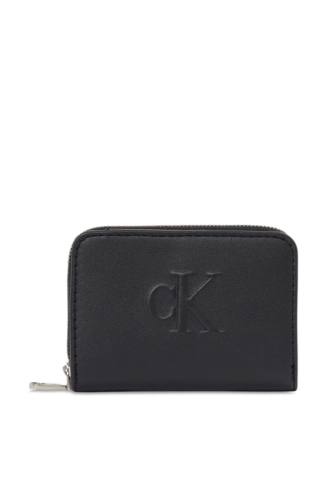 ארנק מבית Calvin Klein, עשוי עור טבעוני חלק בצבע שחור, עם כיס חיצוני ובסגירת רוכסן. בחלוקתו הפנימית ארבעה חריצים לכרטיסים, שלושה תאים - אחד מהם תא רוחב לשטרות וכיס למטבעות הנסגר בכפתור תיק תק.