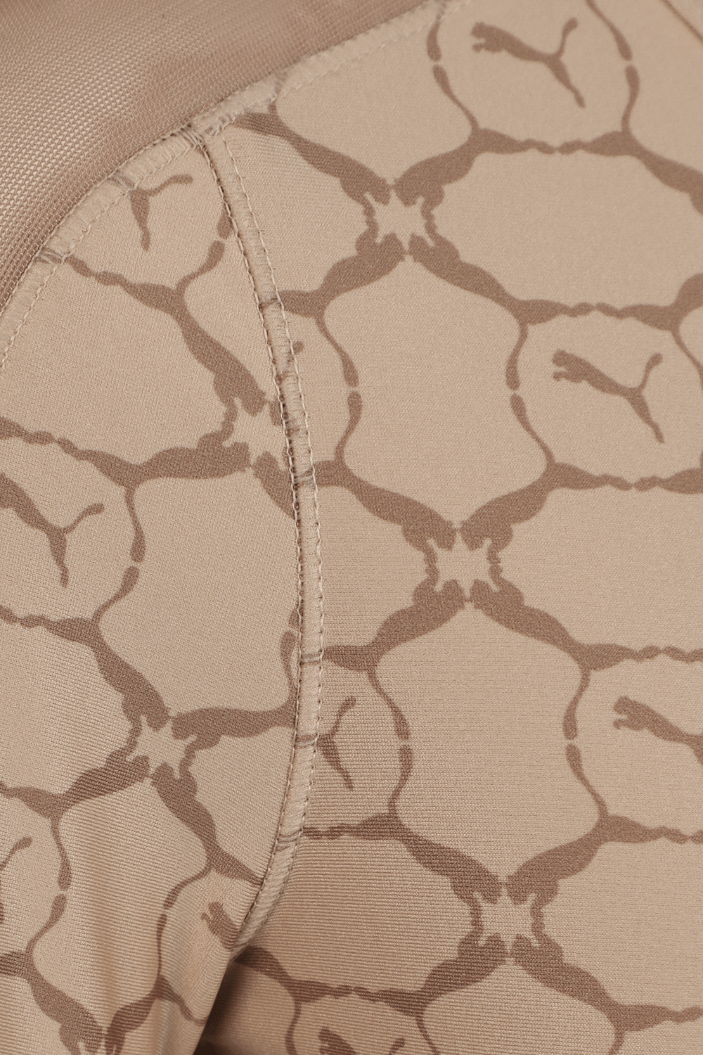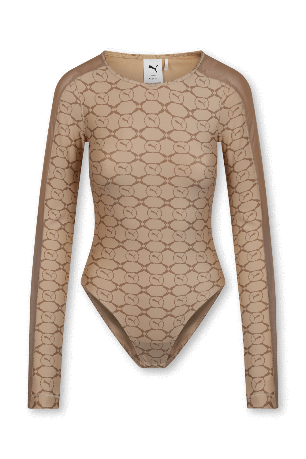 בגד גוף מתוך קולקציית הקפסולה היוקרתית Couture Sport של Puma, המחברת בין בגדי ספורט לאופנת קוטור. בגד גוף T7, בגוון זהוב עם הדפס חזרתי הכולל את מונוגרמת הלוגו של המותג, בסגירת תיק תקים בחלקו התחתון. הוא עשוי מבד ממוחזר אלסטי במיוחד בטכנולוגיית dryCELL המנדף זיעה ושומר על גוף יבש, בשילוב רשת שקופה בצידי השרוולים. ליצירת סט אתליז`ר מדהים עם בגד גוף תואם מהסדרה.