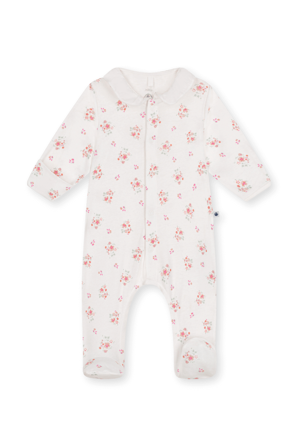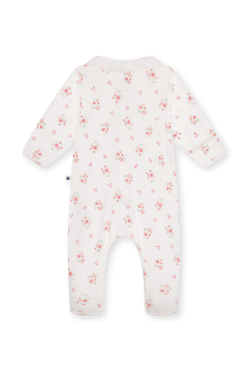 בגד גוף מבית Petit Bateau, עשוי כותנה בצבע לבן ובהדפס פרחוני בשילוב כפתורים מהצווארון ועד הסיומת ללבישה קלה ונוחה. בנוסף, לאוברול ישנן רגליות אשר שומרות על חום הגוף.