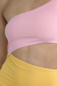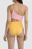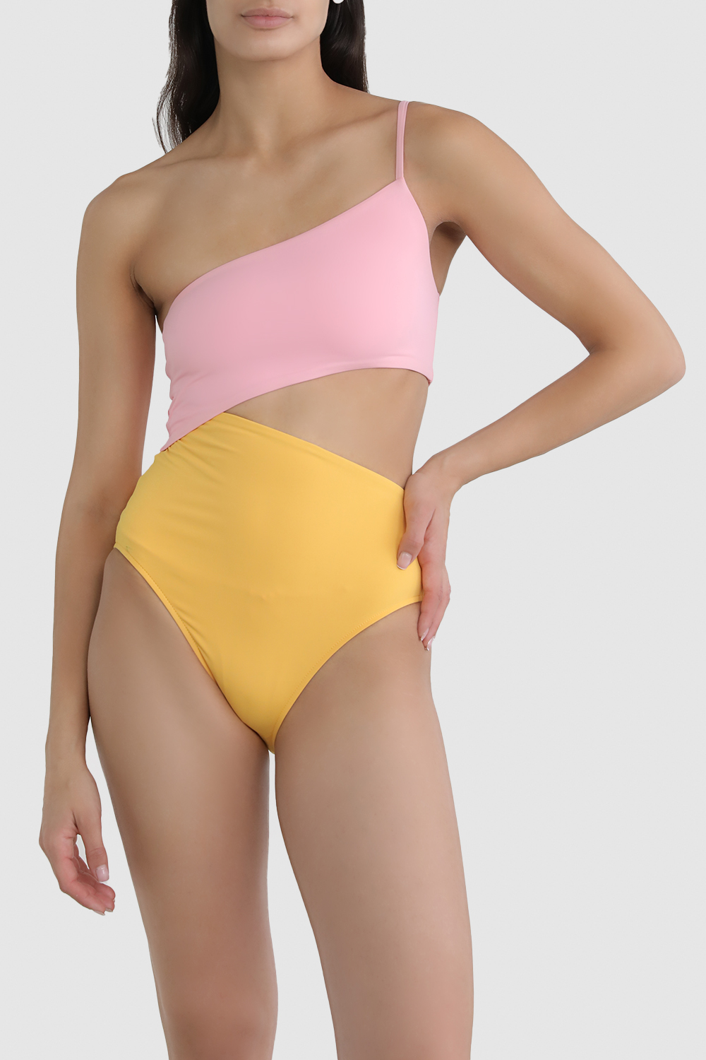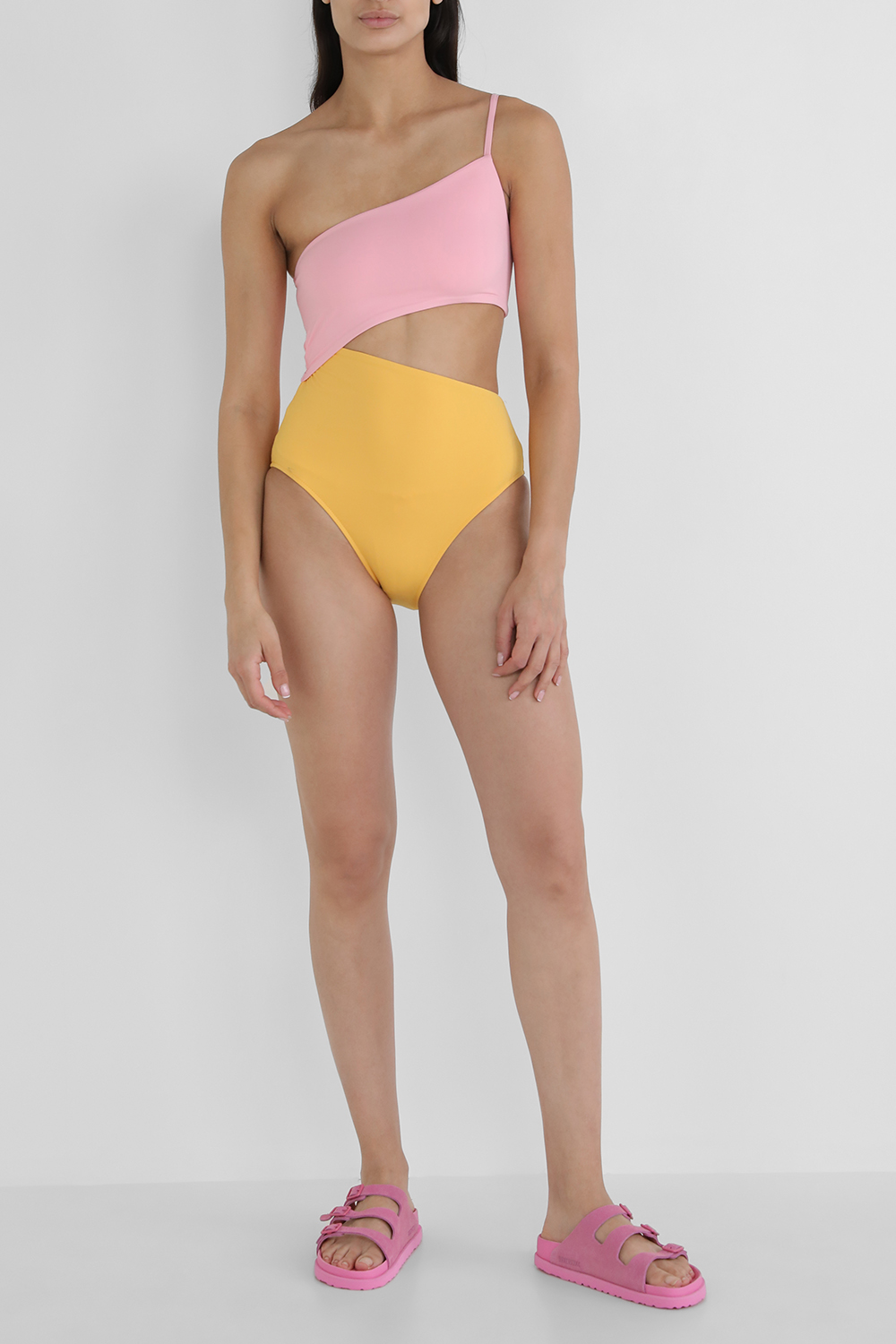 בגד ים שלם מדגם Sigourney מבית BONDI BORN. הדגם עשוי פוליאמיד גמיש בצבע ורוד בגזרה גבוהה, קשירת חזה קדמית ופתחי מחשוף א-סימטריים.