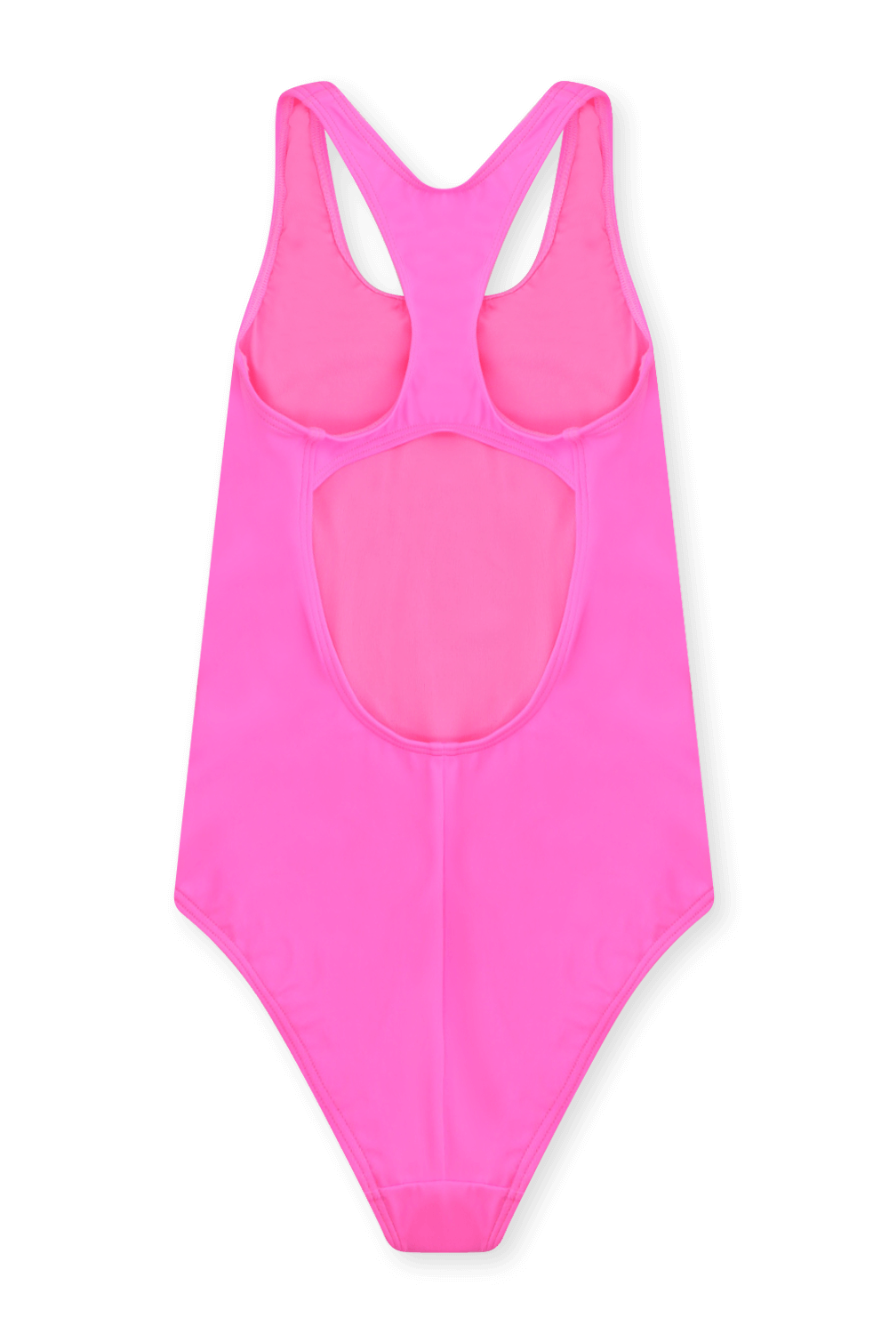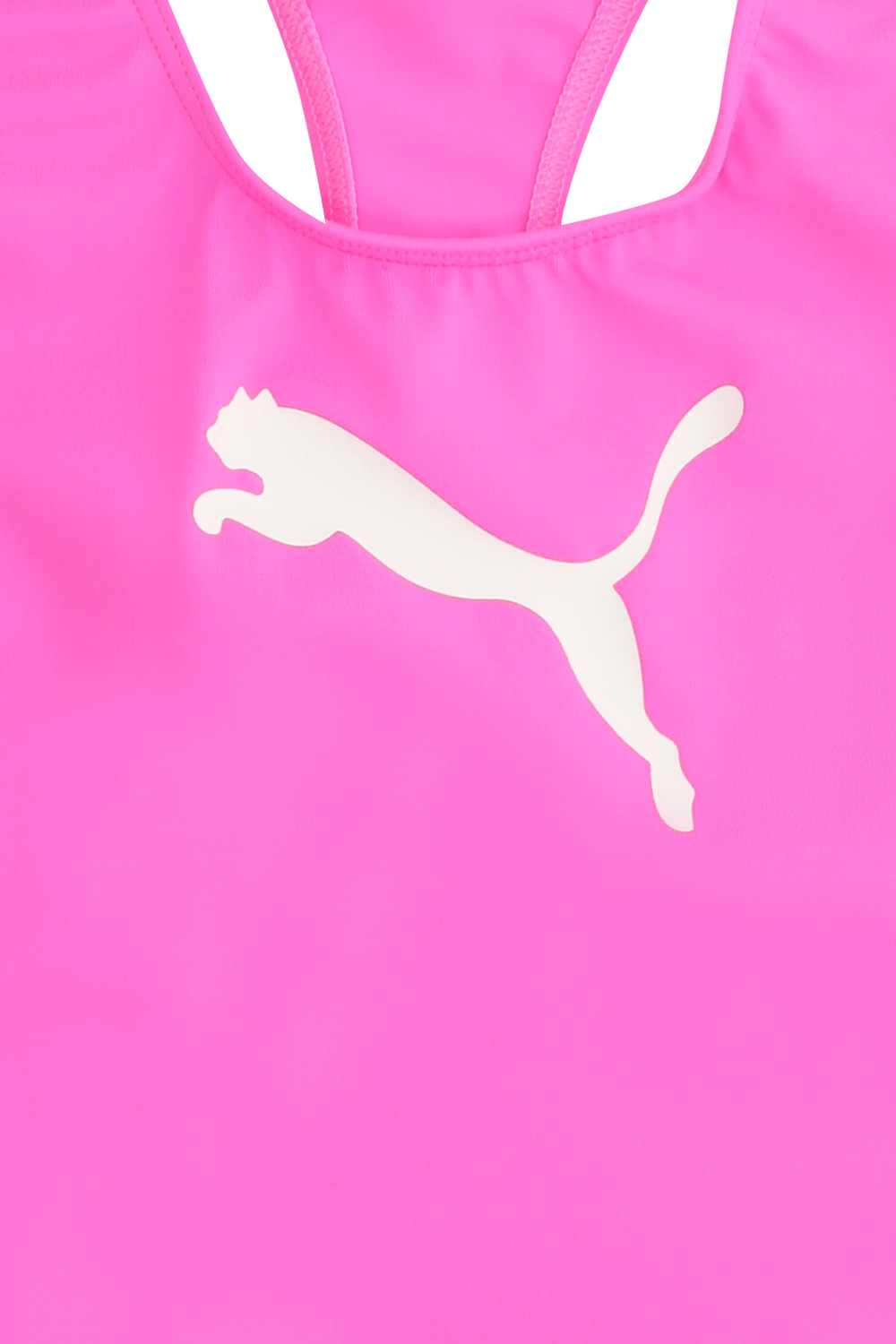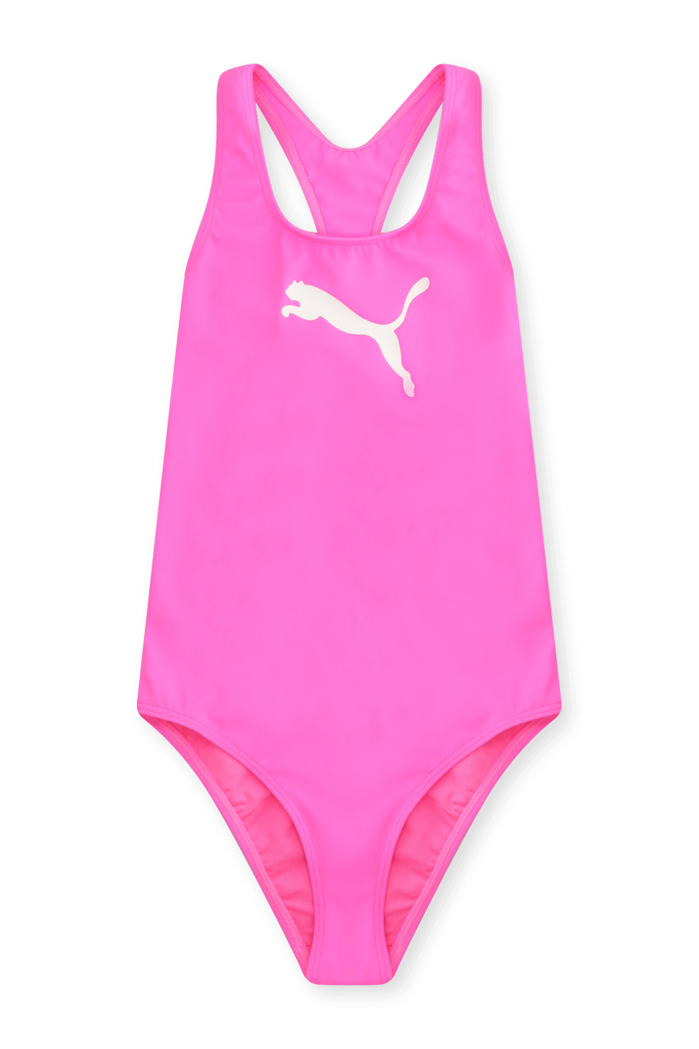 בגד ים שלם בגזרת רייסר בק של Puma בצבע ורוד זוהר, קייצי ובטיחותי. הוא עשוי ניילון עם תו התקן הבינלאומי המחמיר Oeko-Tex של טקסטיל אקולוגי. הבד בעל עמידות גבוהה לכלור, עם הגנת UV50 ובעל יכולת מתיחה נוחה לשני כיוונים.