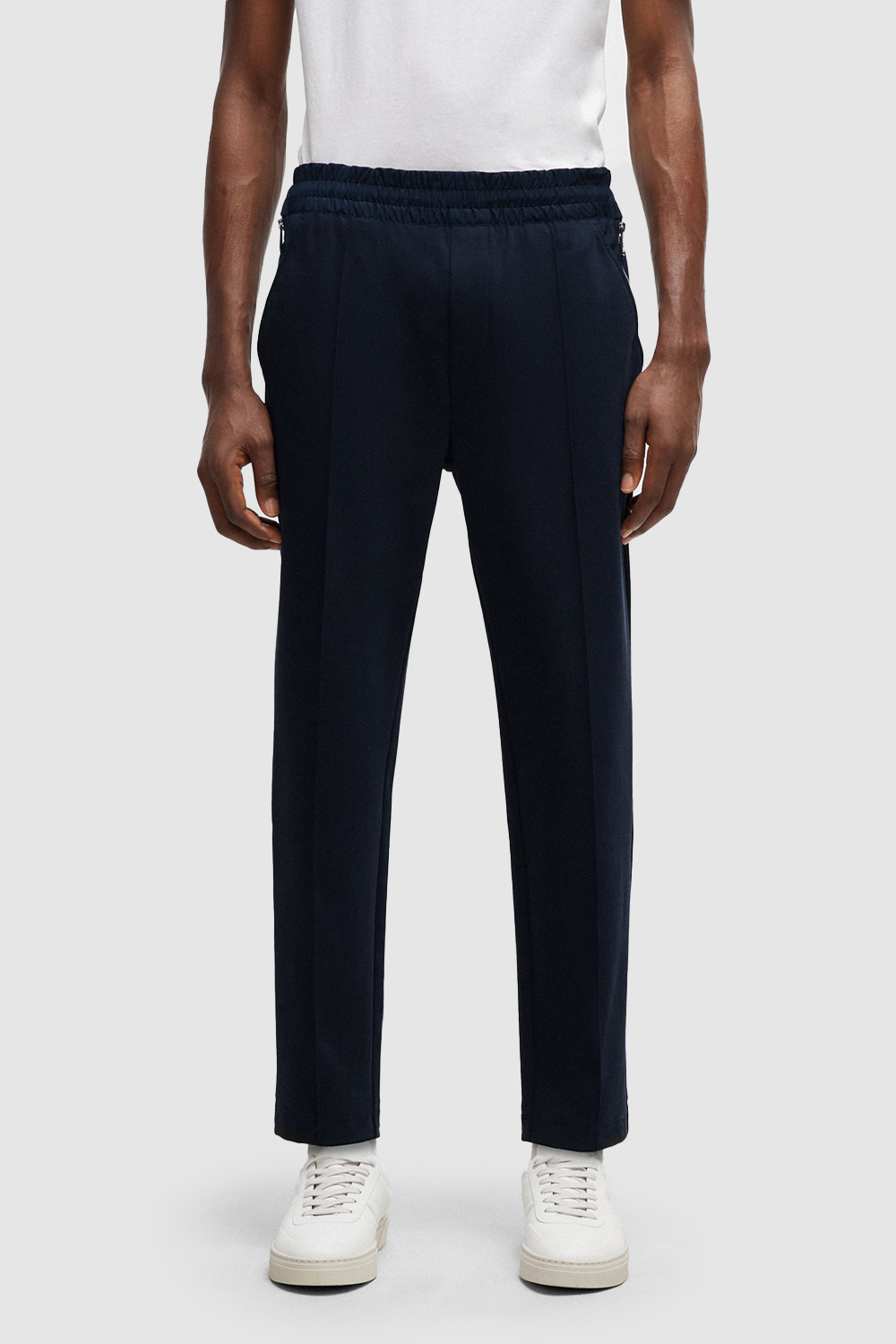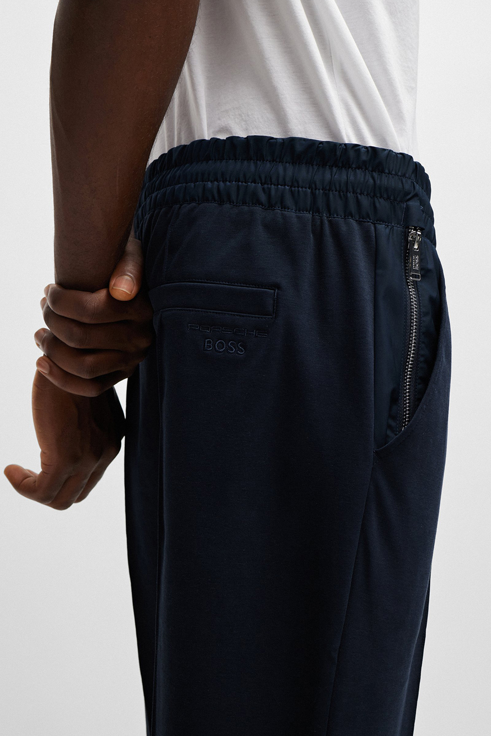 מכנסי ג`וג מתוך שיתוף הפעולה בין Boss ל-Porsche, עשויים תערובת כותנה ואלסטן בצבע כחול כהה עם חגורת מותניים אלסטית.