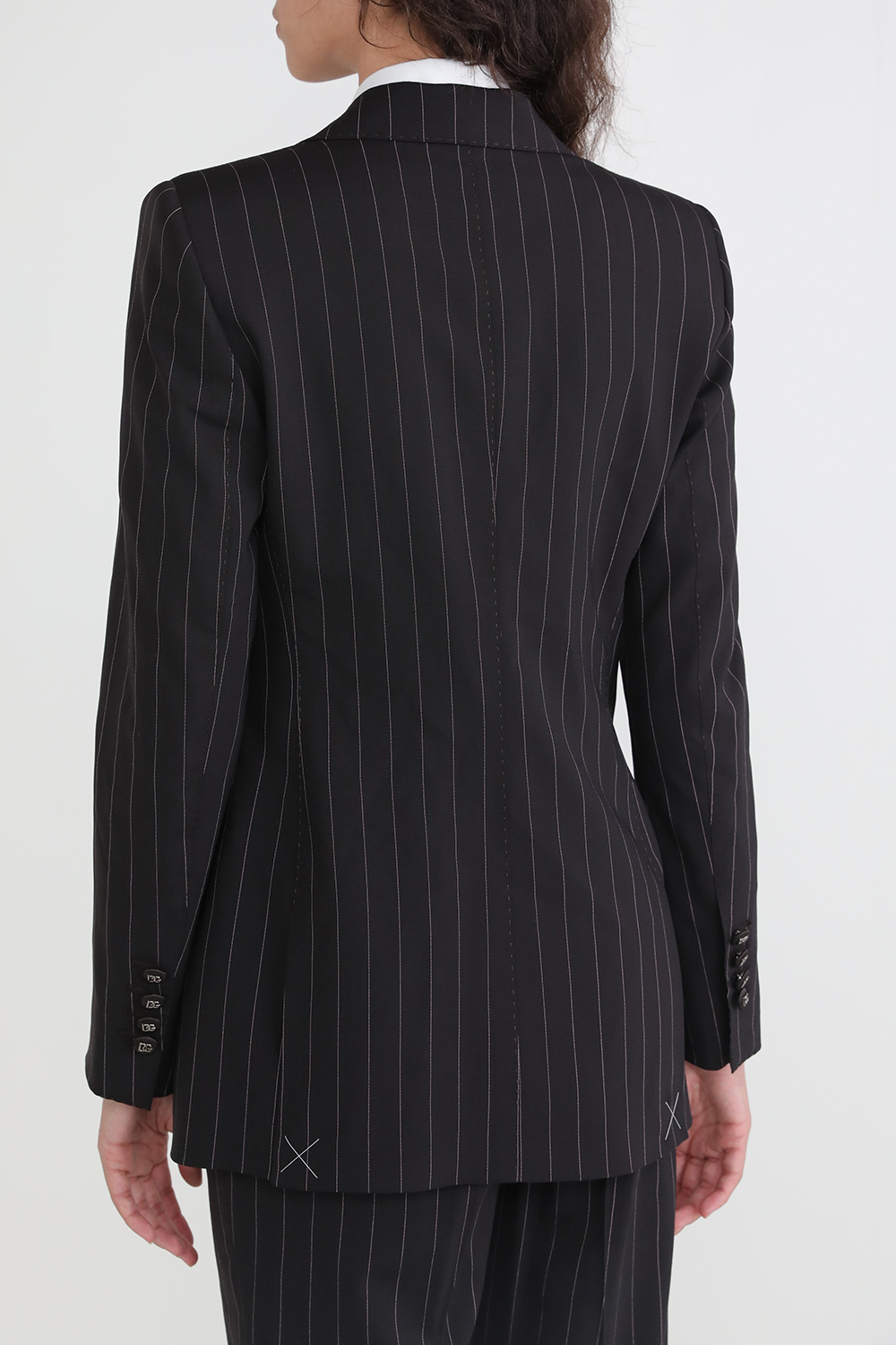 בלייזר מבית Dolce&Gabbana, עשוי צמר בתולי ואלסטן בצבע שחור עם הדפס פסים לבנים עדינים. לבלייזר רפידות בכתפיים, סגירת כפתור ופנים בהדפס חברבורות. להרכבת לוק ניתן לרכוש מכנסיים תואמים.