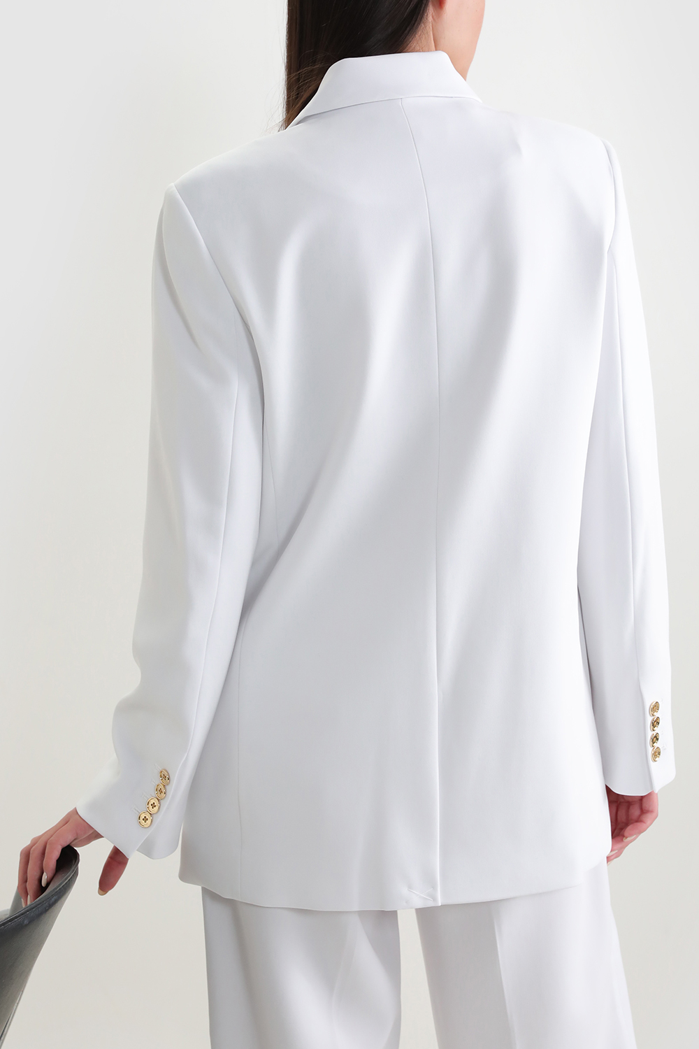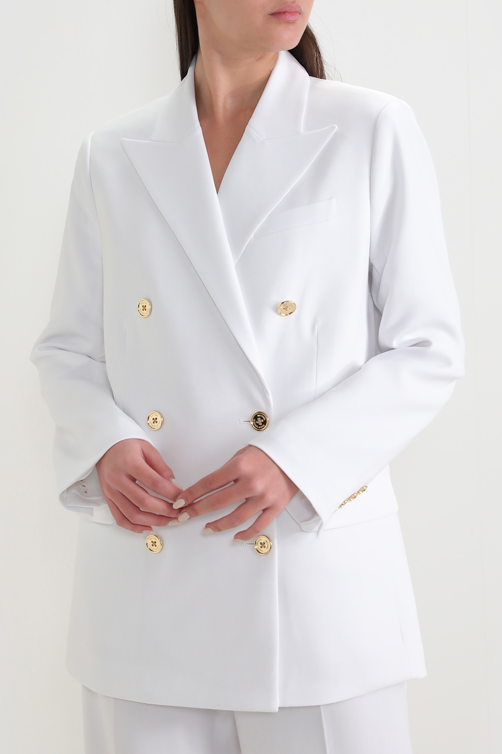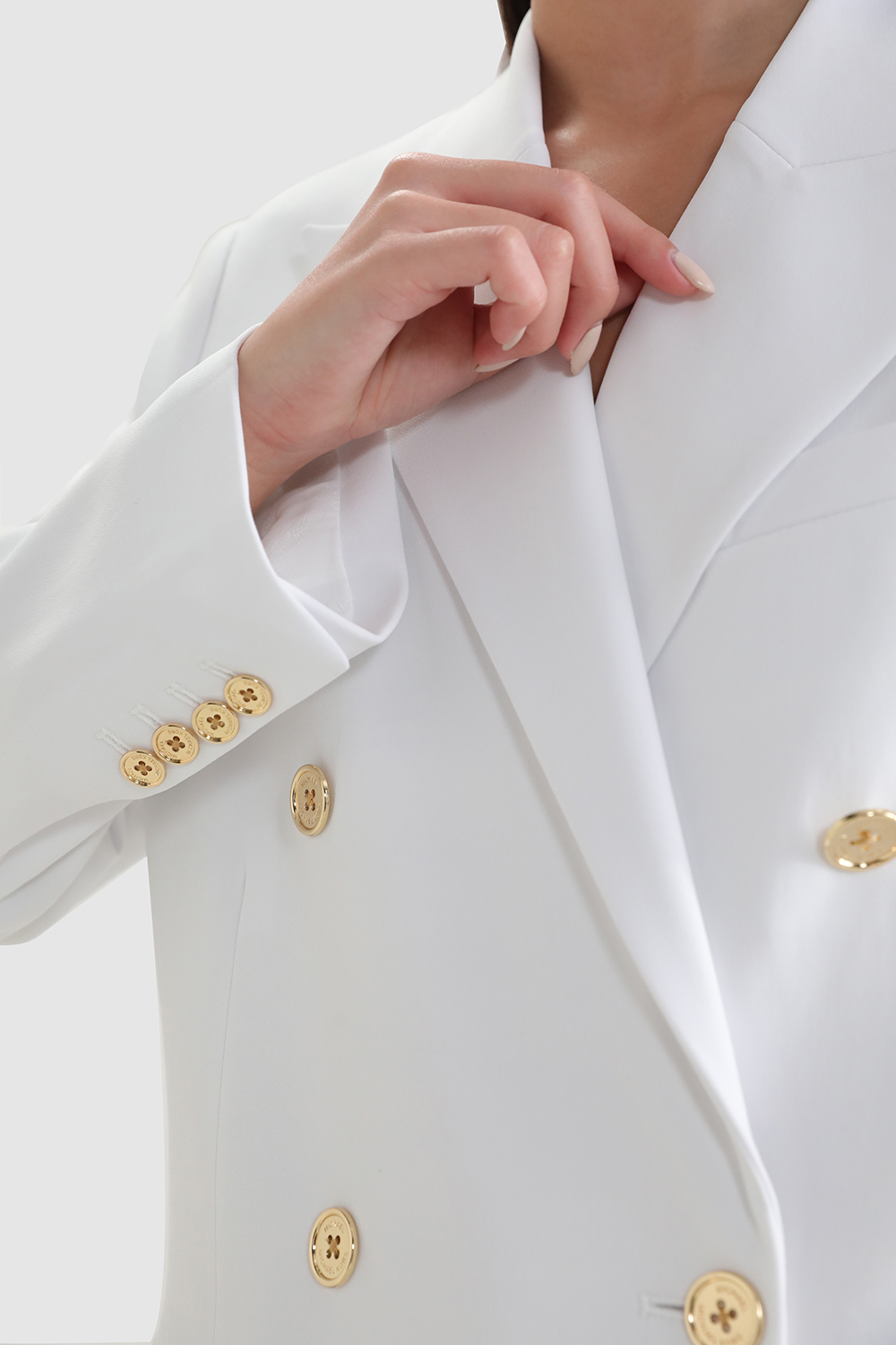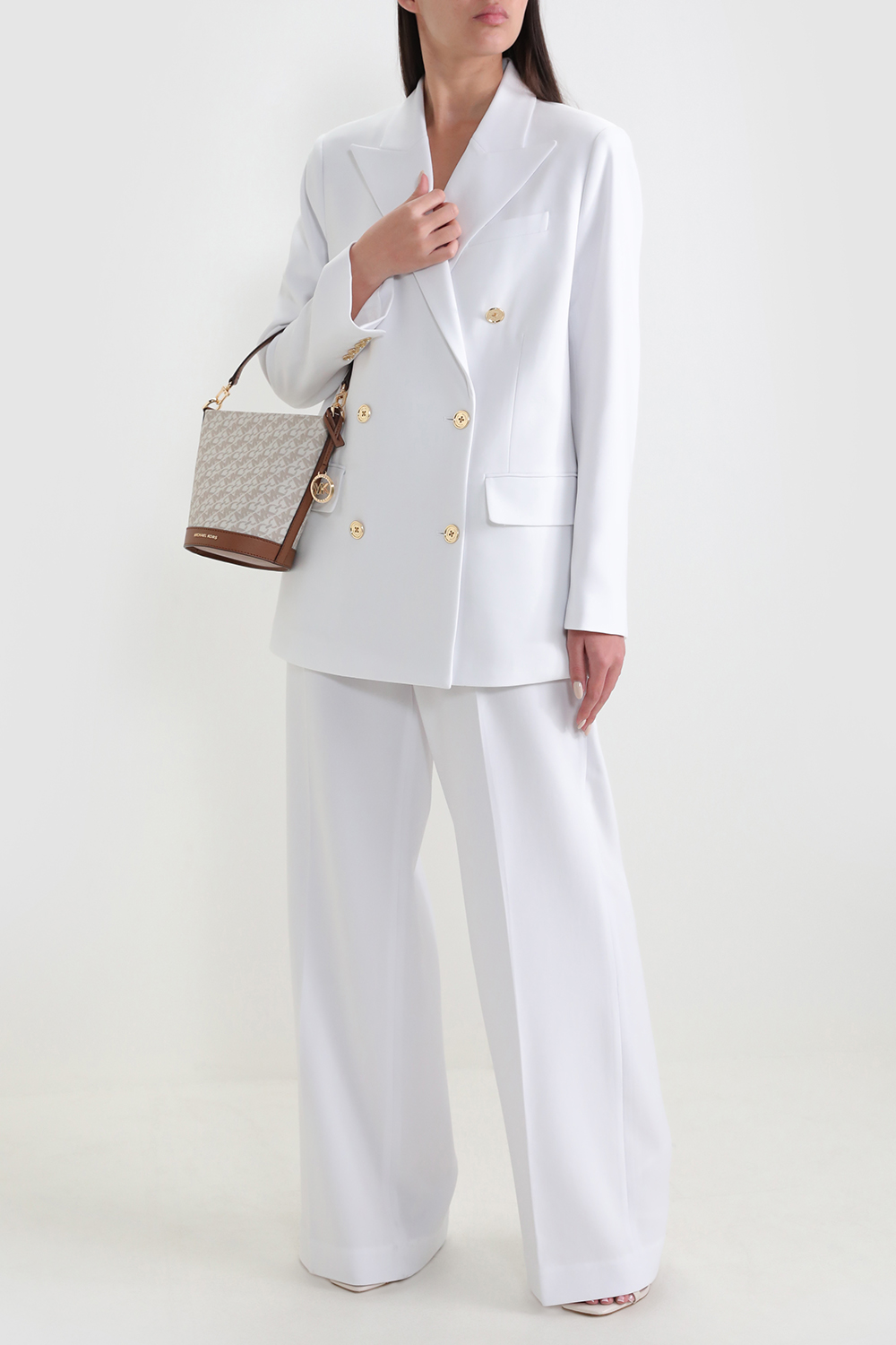 בלייזר מחויט מבית Michael Kors, עשוי תערובת פוליאסטר, אקריליק וצמר בצבע לבן בעיצוב כפתורים מטאליים זהובים בחזית. לבלייזר צווארון מחודד בשילוב שני כיסי צד וכיס פנימי.
