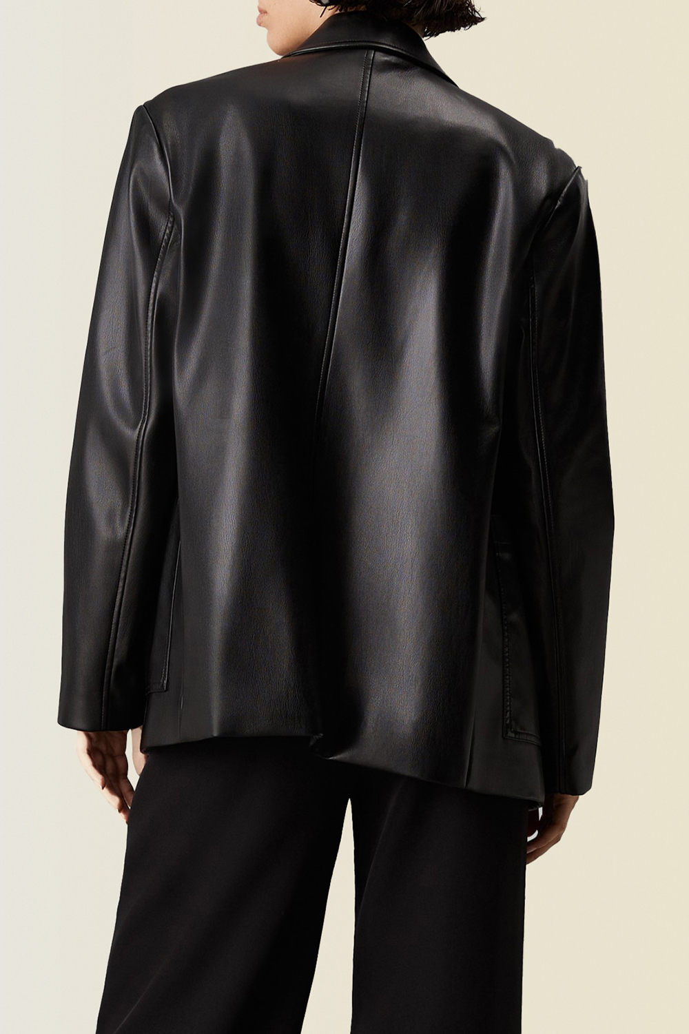 בלייזר מבית Calvin Klein, עשוי עור טבעוני בצבע שחור בשילוב שלושה כפתורים לאורך החזית עם שני כיסי צד. ניתן לשלב את הבלייזר עם מכנסיים ארוכים תואמים ליצירת סט במראה דמוי עור.