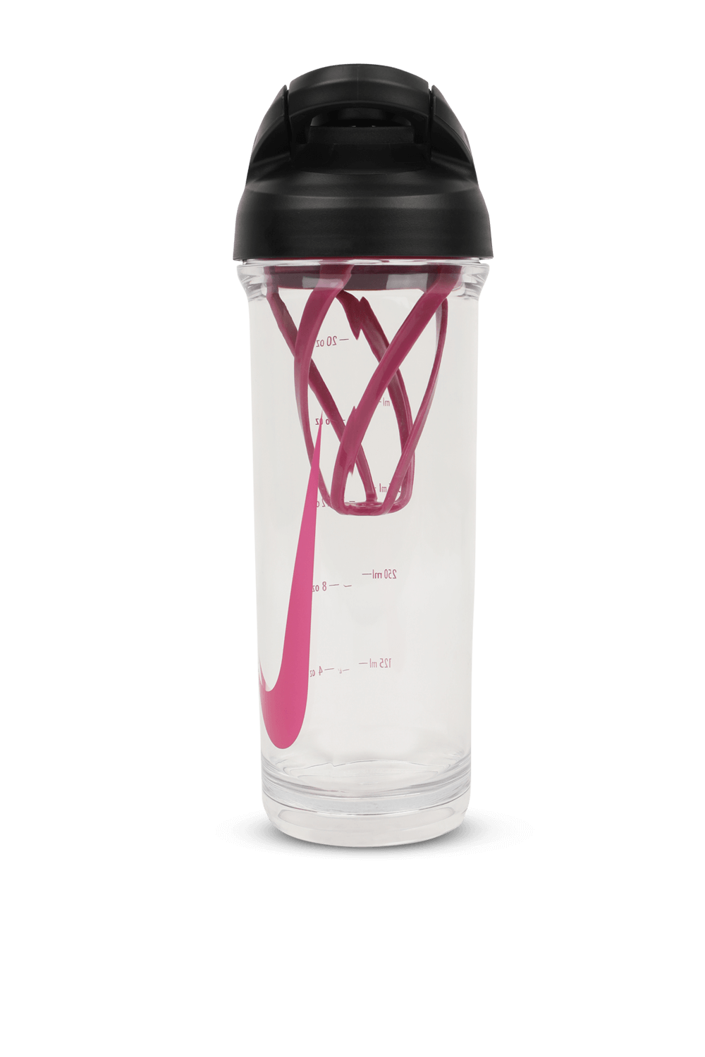 בקבוק שייקר מבית נייקי. זהו בקבוק שקוף עם מכסה שחור וושייקר ורוד שיעזור לך לערבב בקלות את תוספי התזונה שלך ולשתות אותם לפני או אחרי האימון לבוסט נוסף של אנרגיה וכוח. 710 מ''ל