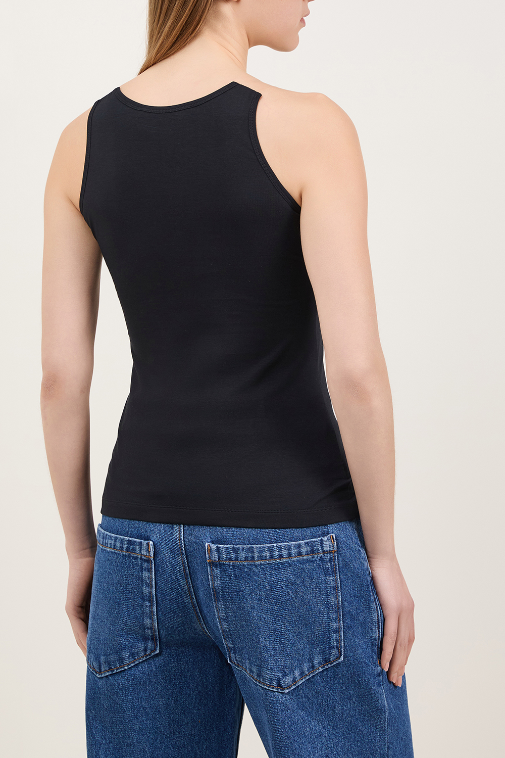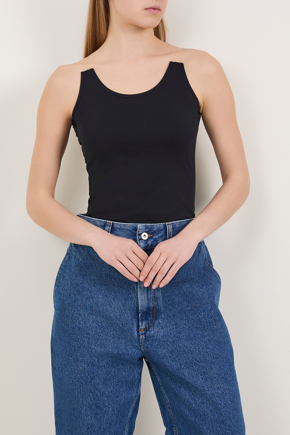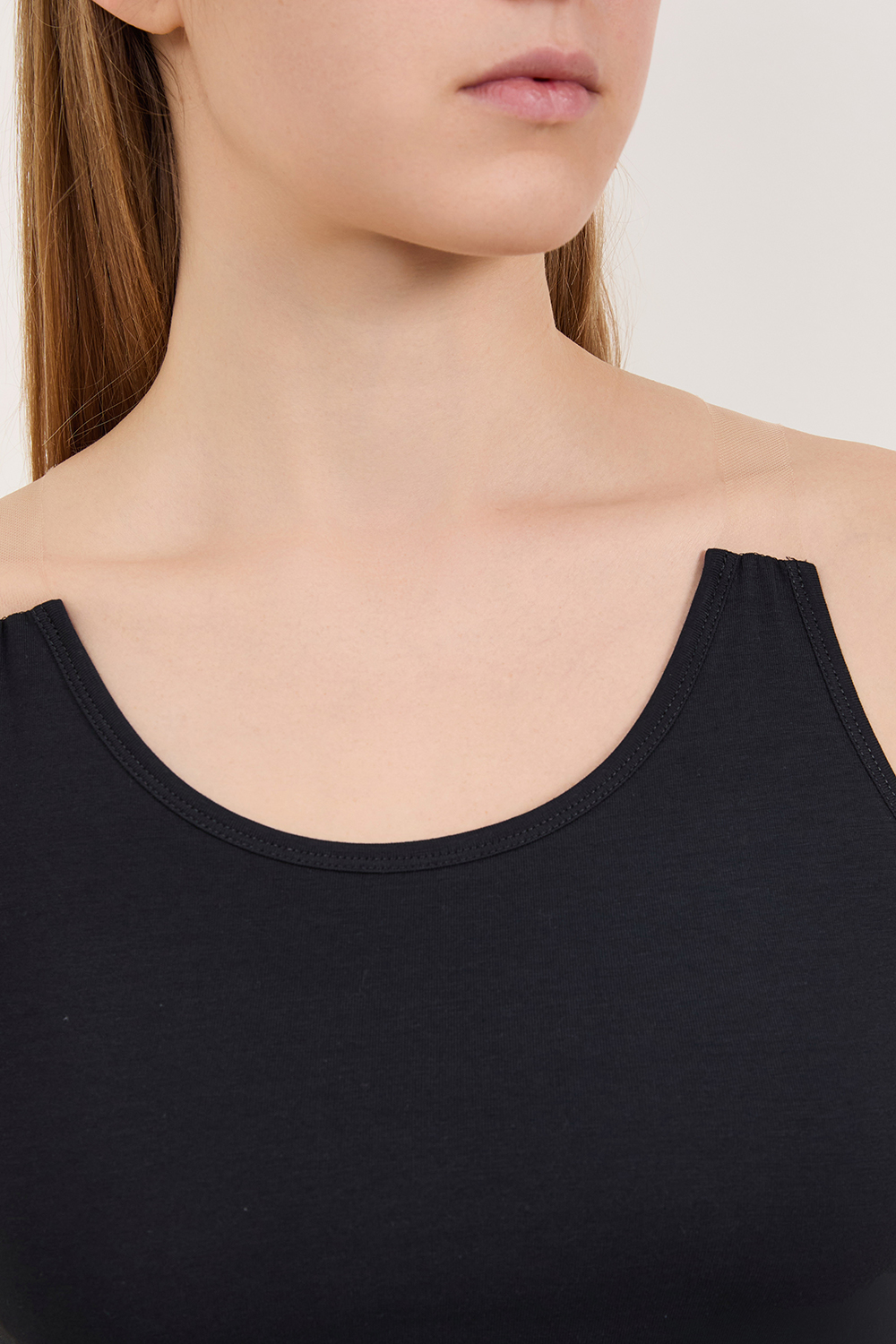 גופייה בעיצוב יחודי מבית Duran, עשויה כותנה בצבע שחור עם כתפיות שקופות המעניקות לה מראה צף.
