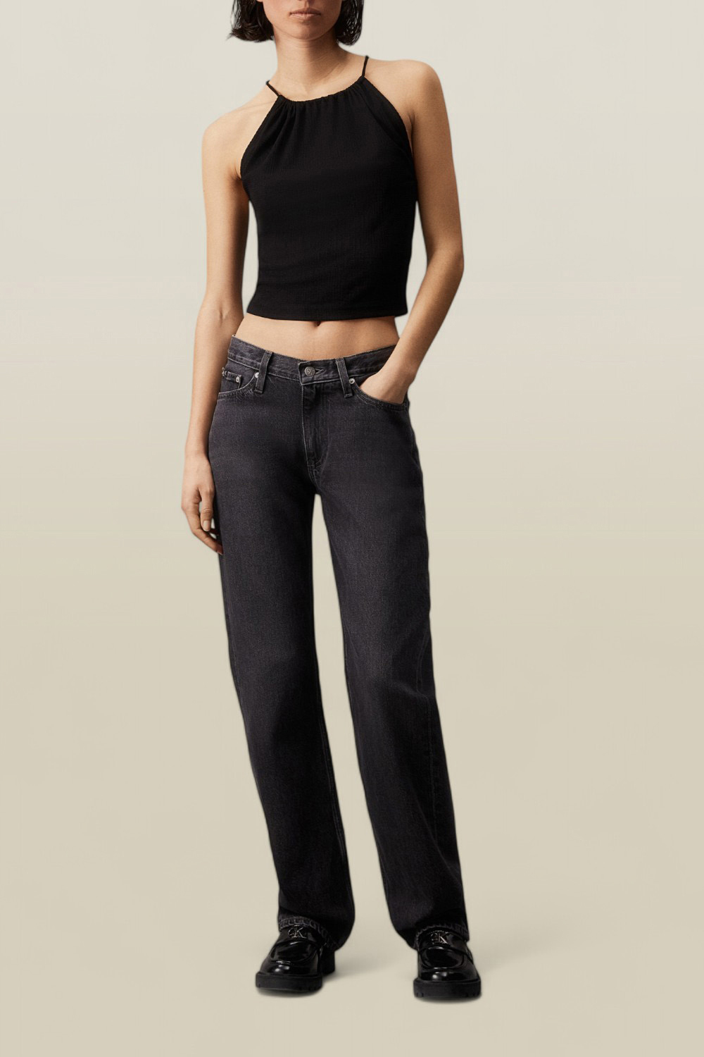גופייה מבית Calvin Klein, עשויה תערובת פוליאסטר ממוחזר בחלקו ואלסטן בצבע שחור, ובשילוב רצועות כתפיים דקות עם אבזם מתכוונן במראה איקס בגב.