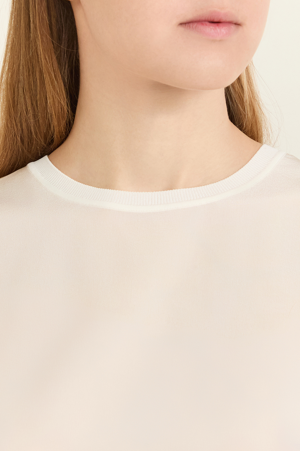 גופייה מבית Joseph, עשויה משי קרפ דה צ'ין מעט שקוף, בצבע שמנת עם שולי ריב בצווארון ובשרוולים.