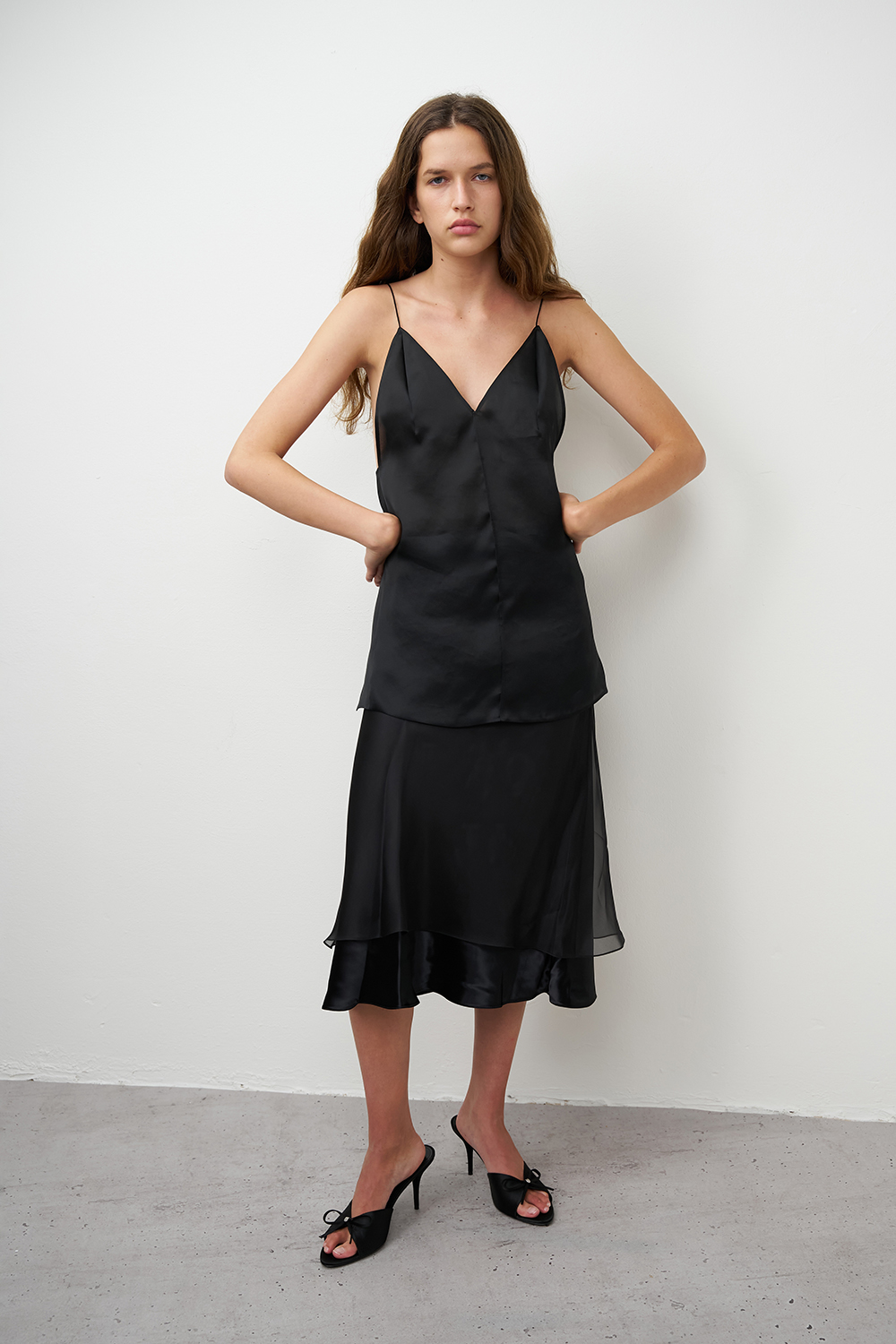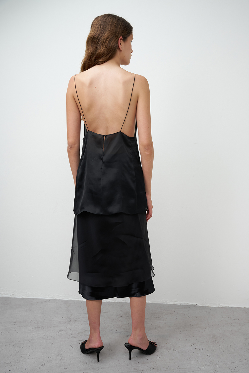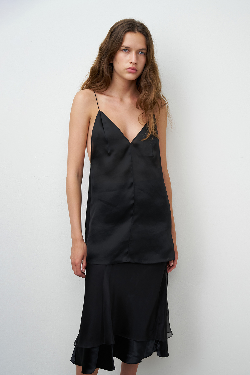 גופיית סליפ-און Talsie מבית khaite, עשויה משי אורגנזה בצבע שחור עם כתפיות ספגטי.