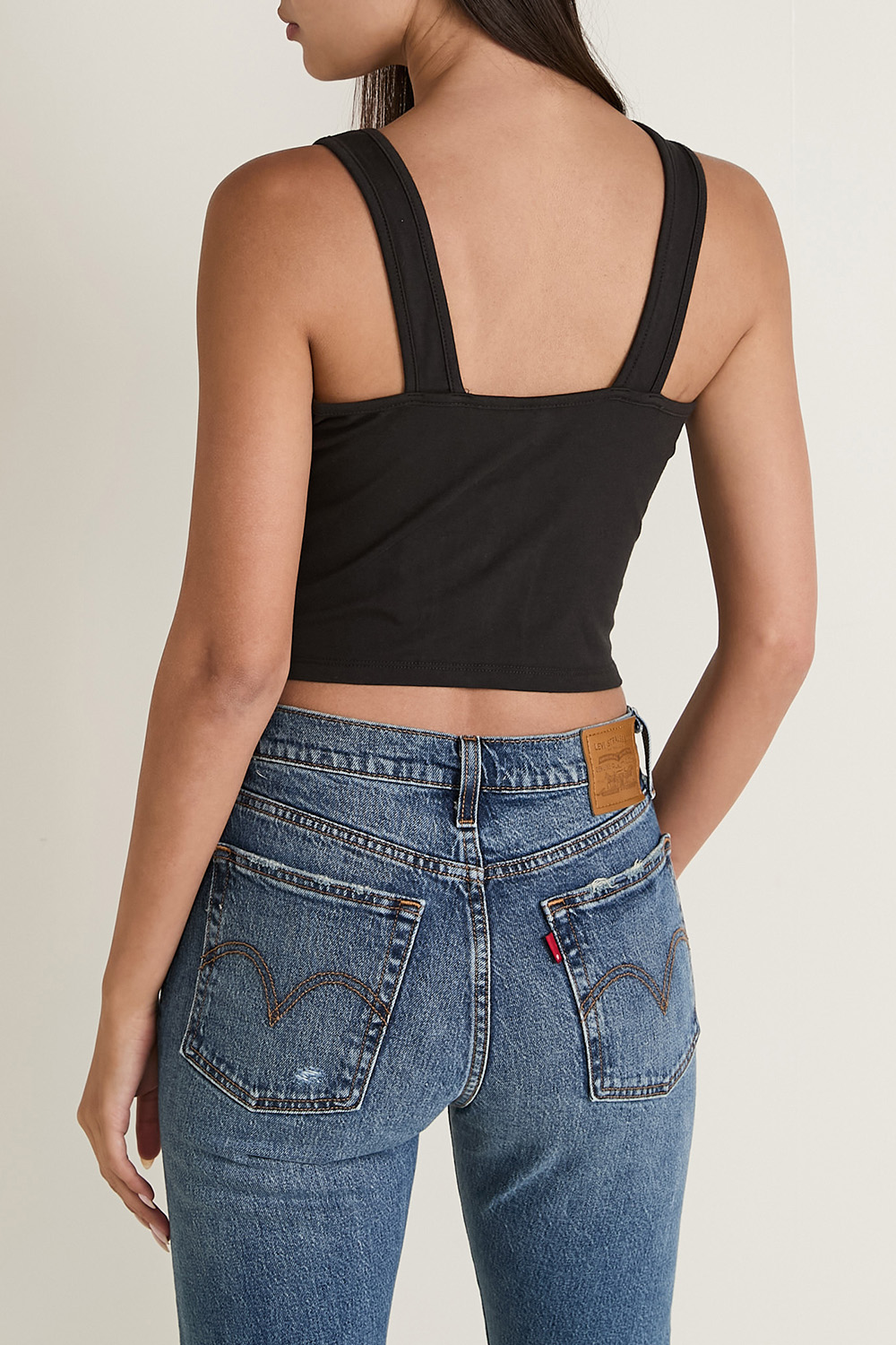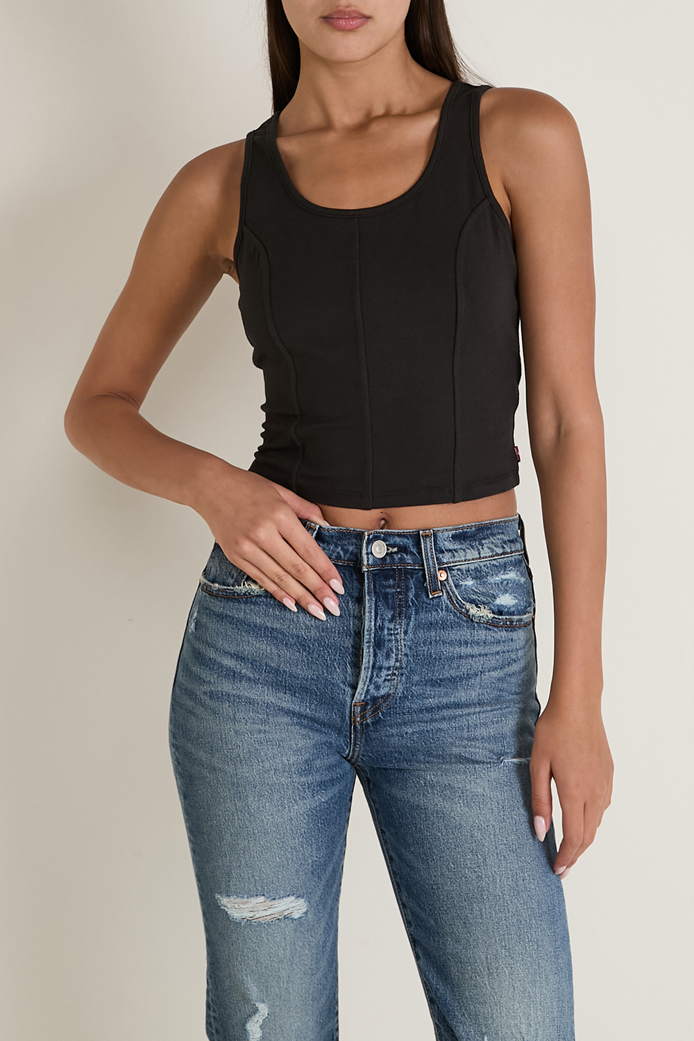 גופיית קרופ מבית Levi's, עשויה תערובת כותנה ואלסטן בצבע שחור ובעיצוב תיפורים בולטים בהשראת מראה מחוך קלאסי.