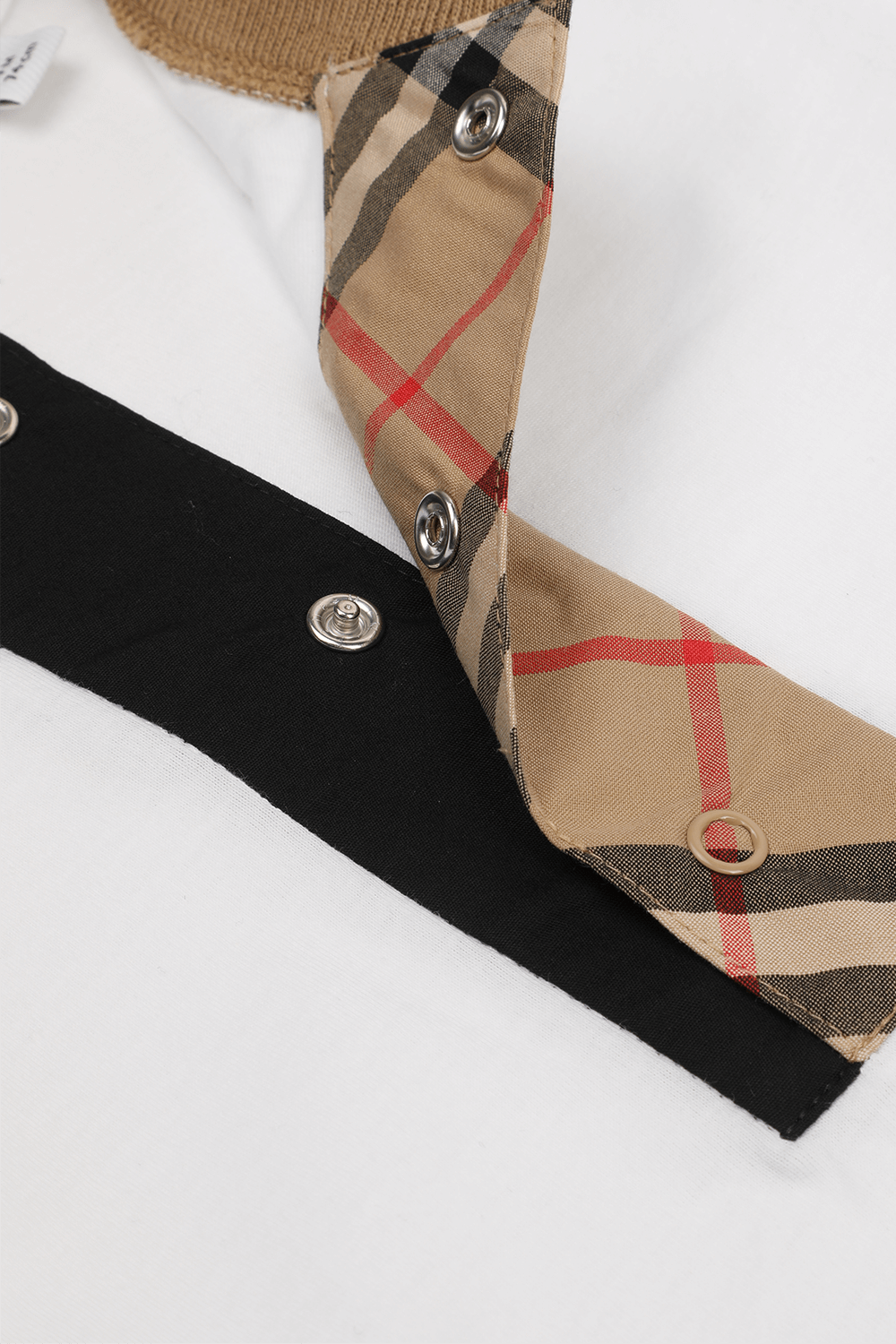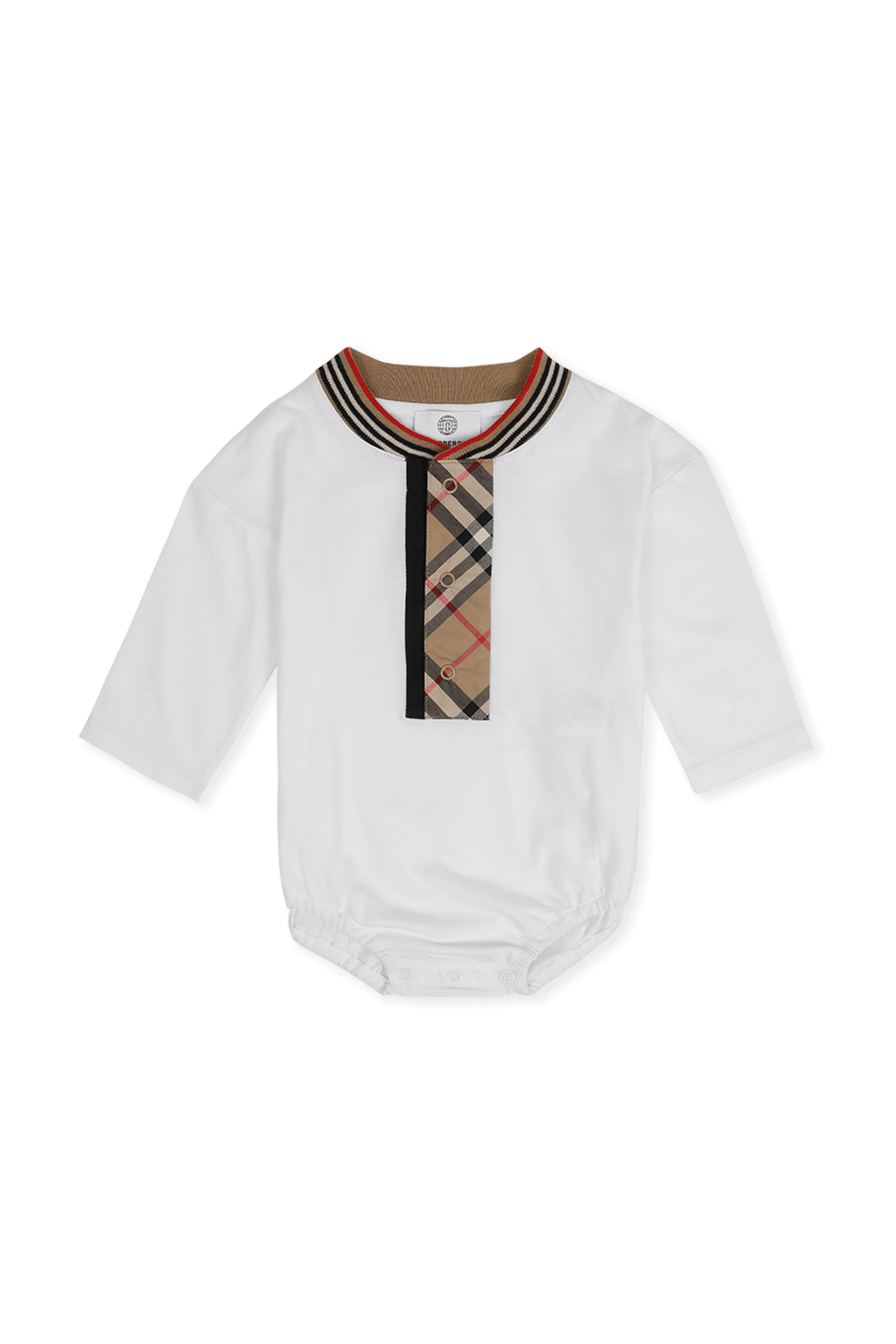 בגד גוף לבן וסופר איכותי בעיצוב בית האופנה היוקרתי ברברי. דגם התפור מ-100% כותנה רכה ונעימה עם לוגו המותג בחזית עם צווארון בריגת ריב ובדוגמת המשבצות האייקונית, לצד פאנל רכיסה בדוגמה זהה. לבגד הגוף שרוולים ארוכים בשילוב סגירת תיק-תק סטרצ'ית בחלקו התחתון המשלימים את סגנונו הסופר מתוק של הפריט עבור הרך הנולד.
