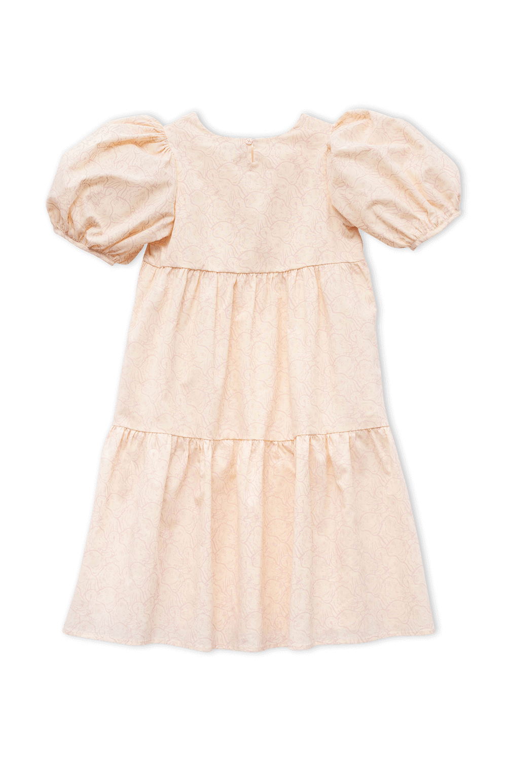 שמלת שכבות יפיפייה מבית קנזו. זוהי שמלה העשויה מתערובת רכה ומשובחת של כותנה ופשתן בגוון בז` עדין עם הדפס של דמויות הנמר והפיל המזוהיים עם המותג. לשמלה שרוולי קצרים ומעט תפוחים הנחתמים באמרות אלסטיות ומציגה גזרת שכבות עדכנית ומשוחררת עם קפלים עדינים המאפשרת תנועתיות חופשית. חתימת לוגו המותג בגוון ורוד ממוקמת סמוך לאמרה ומשלימה את עיצובה המדויק של השמלה. ניתן לסגנן עם נעלי בובה להשלמת לוק מתוק במיוחד.