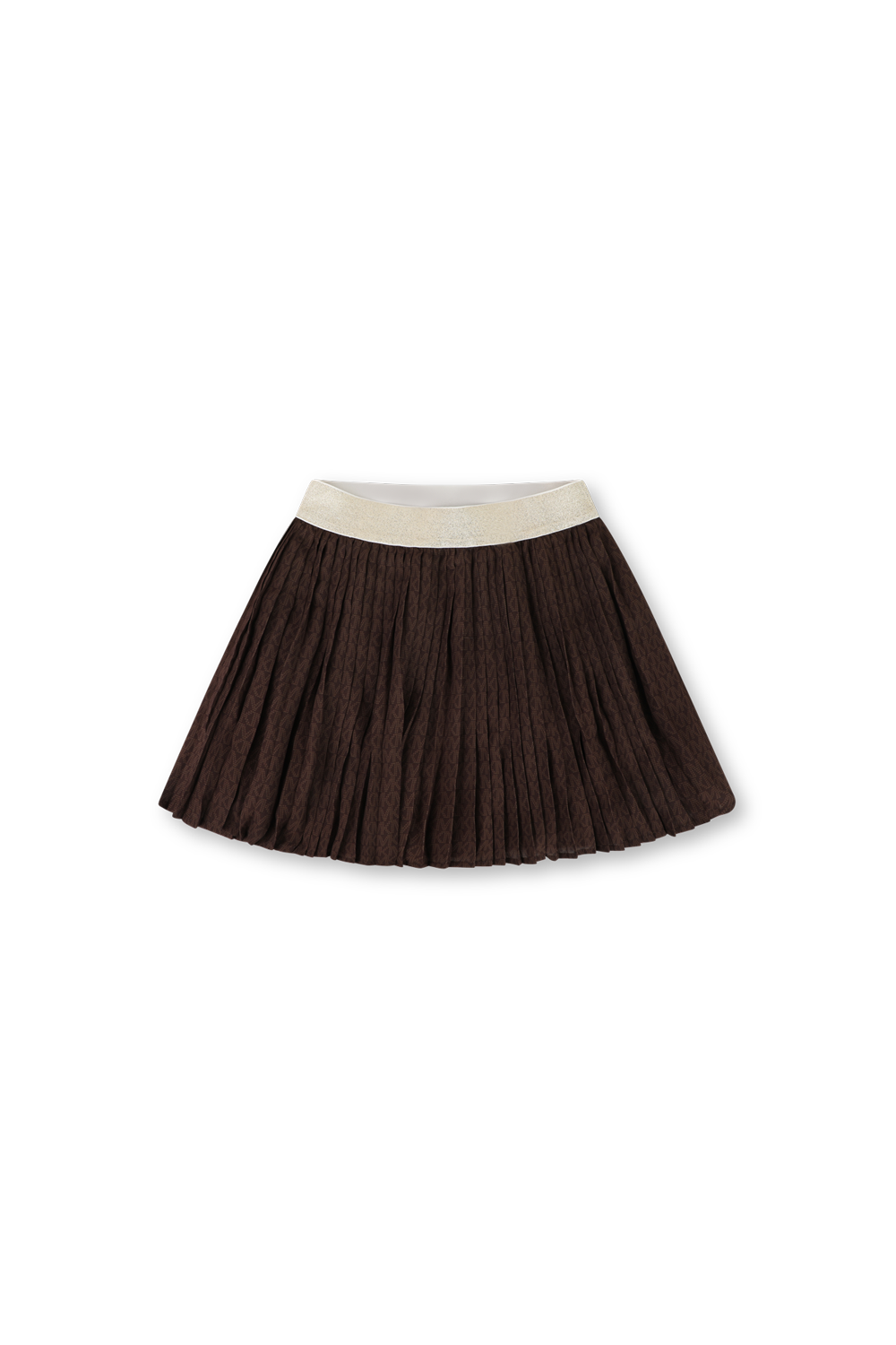 חצאית מיני מבית MICHAEL KORS KIDS האמריקאי. זהו דגם העשוי טקטסיל איכותי בצבע חום עם הדפס מונוגרמי למראה שיקי במיוחד. לפריט גזרה מתרחבת ומתנפנפת עם קו מותניים הדוק אך גמיש. מדובר בפיס יפהפה ללוקים בובתיים עבור הקטנטנות.