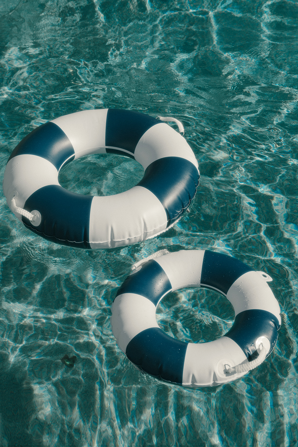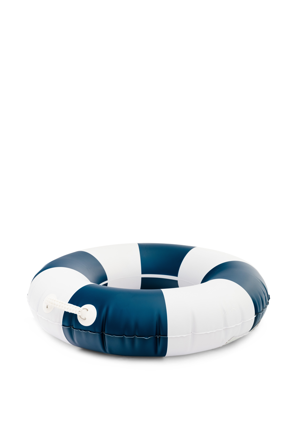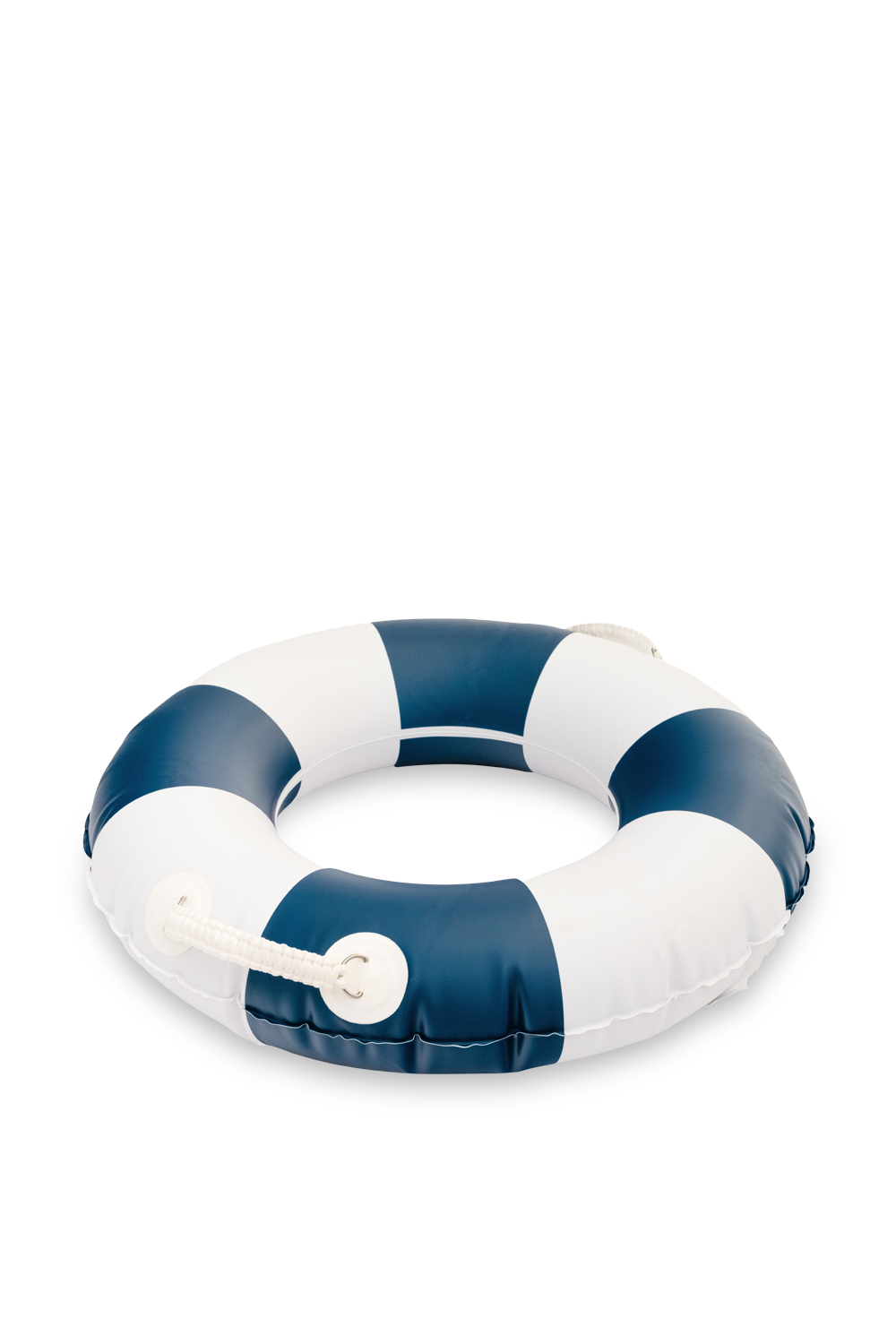 גלגל ים בקוטר 80 סמ מבית Business&Pleasure, עשוי PVC בהדפס פסים כחול ולבן במראה נוסטלגי וקלאסי עם וו תלייה לאחסון וידיות צד.