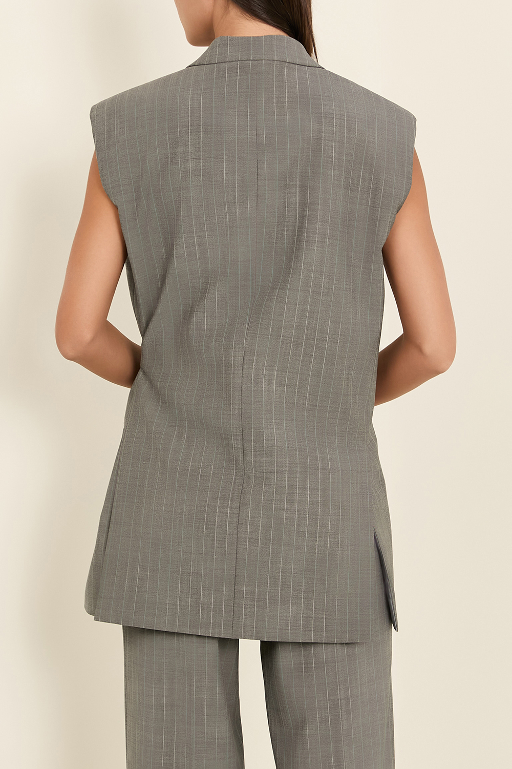 וסט-ז'קט מחוייט Jewelara בגזרה משוחררת מבית Boss. הוא עשוי צמר דק בצבע אפור בדוגמה קלאסית של פסי סיכה, עם ביטנת סאטן אפורה. הוא נסגר ברכיסה כפולה עם כפתור וחגורת מותניים, וניתן ללבוש אותו יחד עם חולצה או בלעדיה. ניתן לשלב כחליפה עם מכנסי קז'ואל רחבים תואמים מתוך הקולקציה.