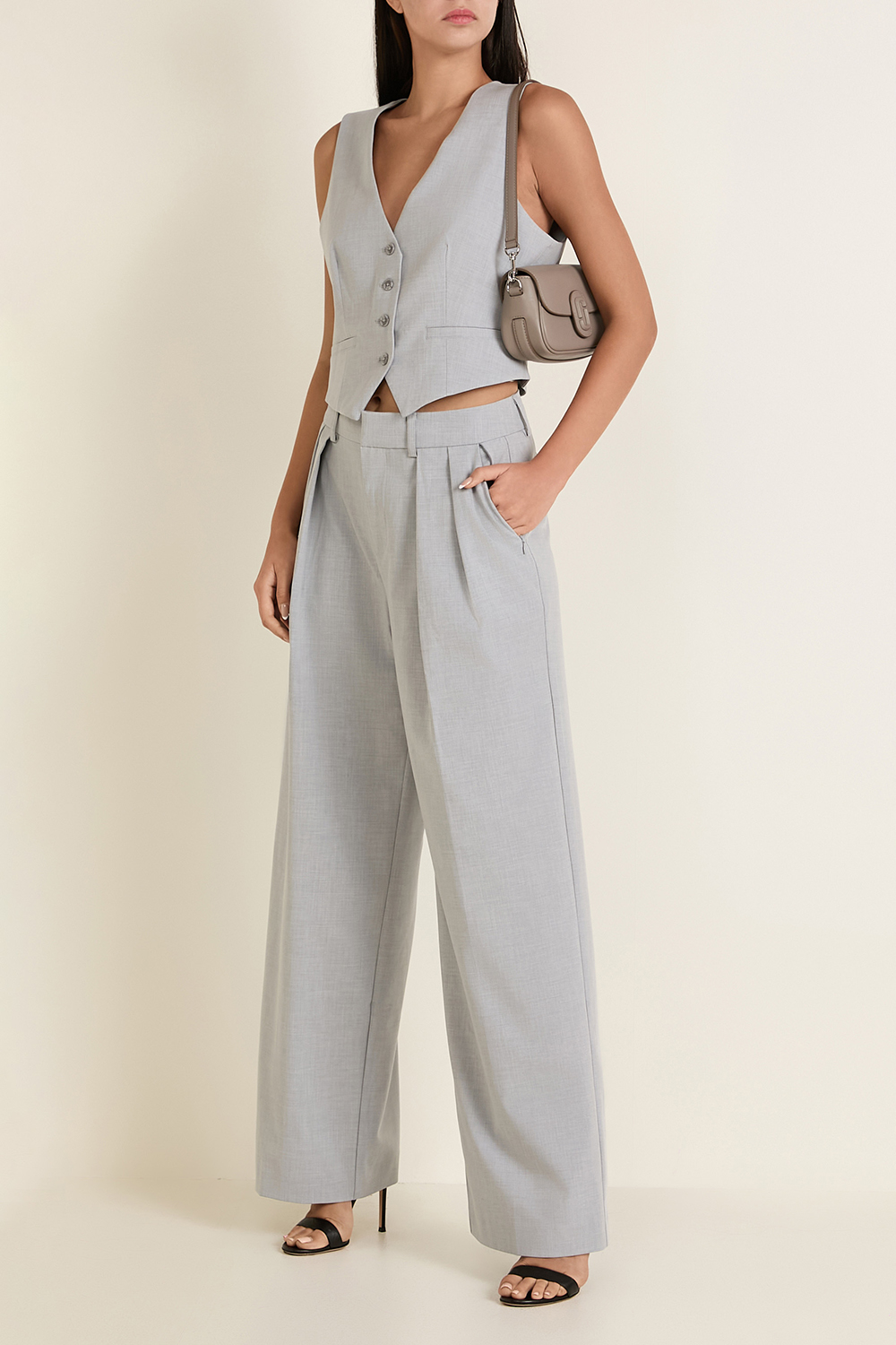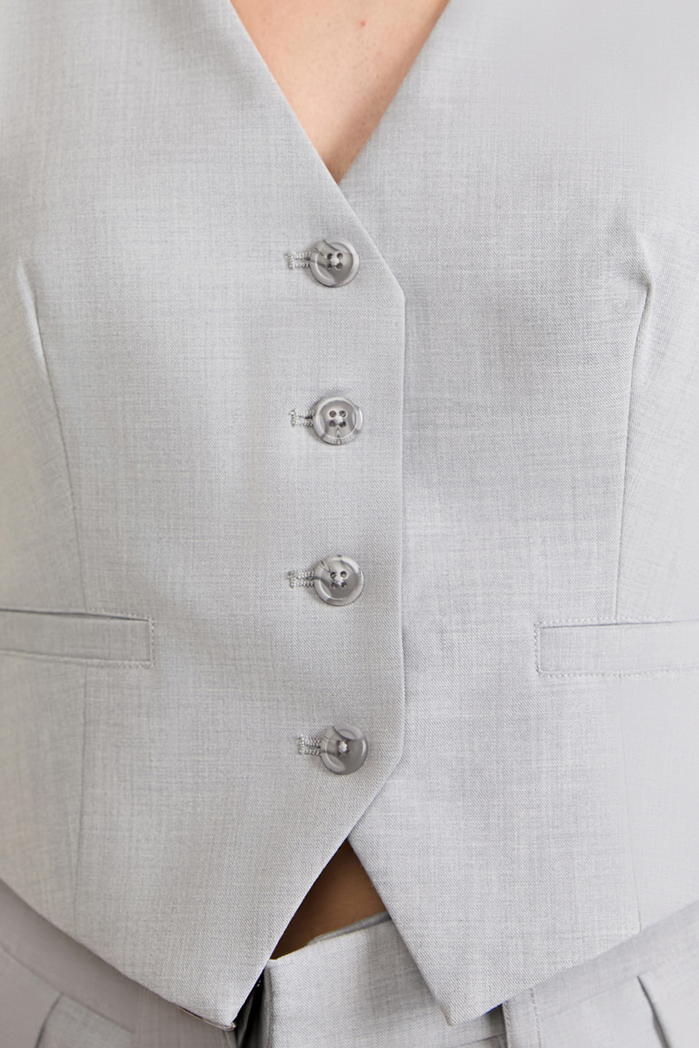 וסט בסגנון מחוייט מבית Good American, עשוי ויסקוזה בצבע אפור, בסגירת כפתורים - ללבישה מעל חולצה או בלעדיה. מומלץ לשלב כחלק מחליפת שלושה חלקים - עם מכנסיים וז'קט תואמים.