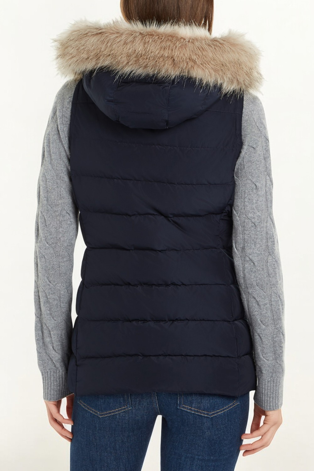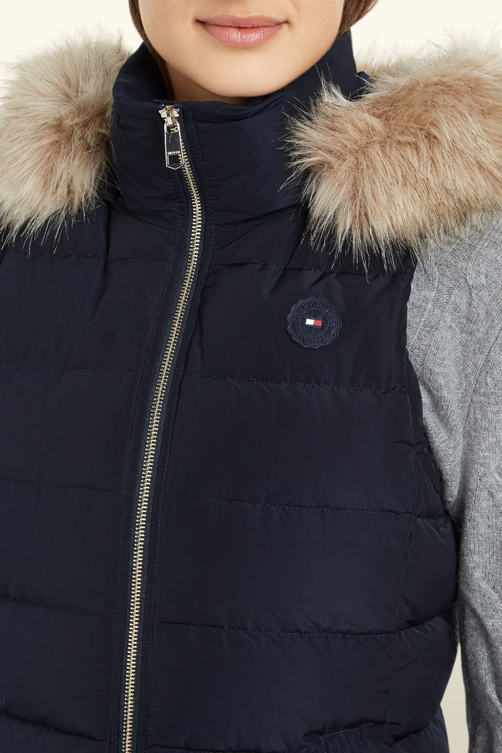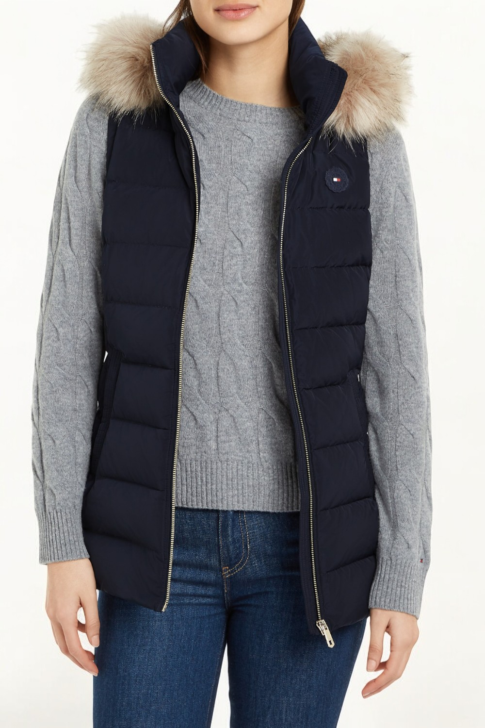 וסט פוך מחמם בעיצוב Tommy Hilfiger, עשוי ניילון ממוחזר העמיד במים בצבע כחול וביטנה אדומה. הווסט מגיע עם קפוצ'ון המעוטר בפרווה טבעונית - הניתנת להסרה באמצעות כפתורי תיק תק. יש לו שני כיסי צד והוא נסגר ברוכסן זהוב.