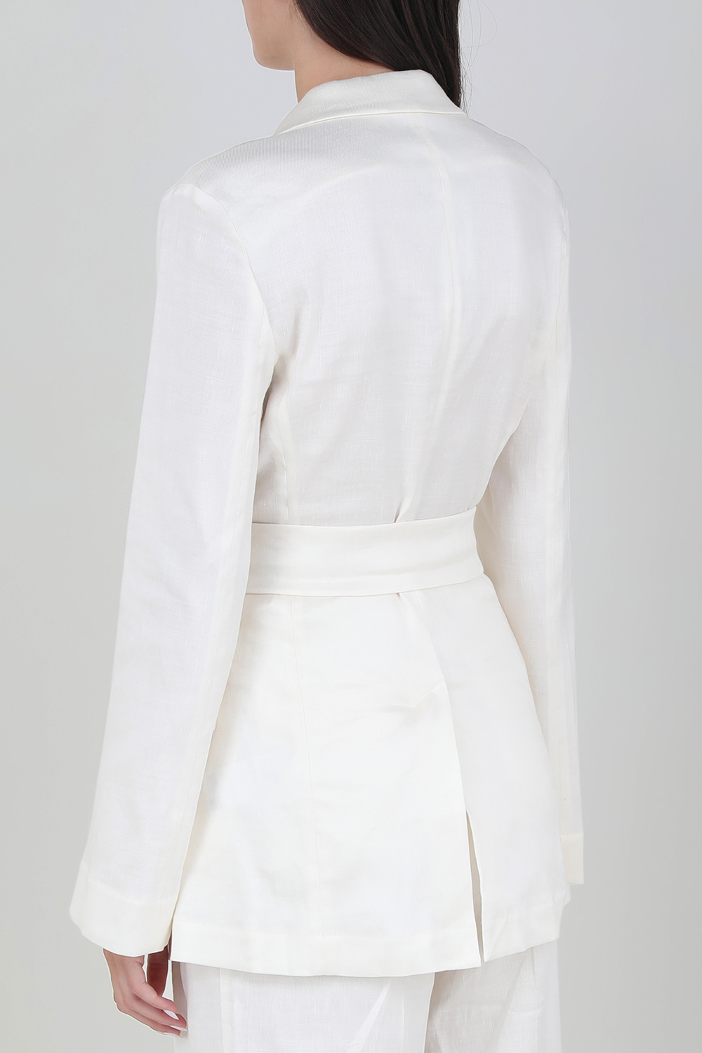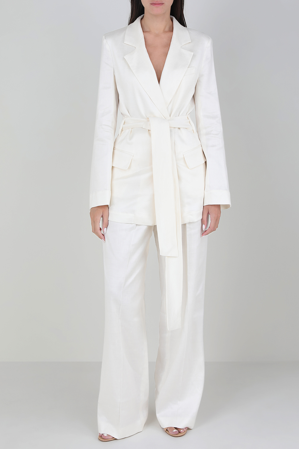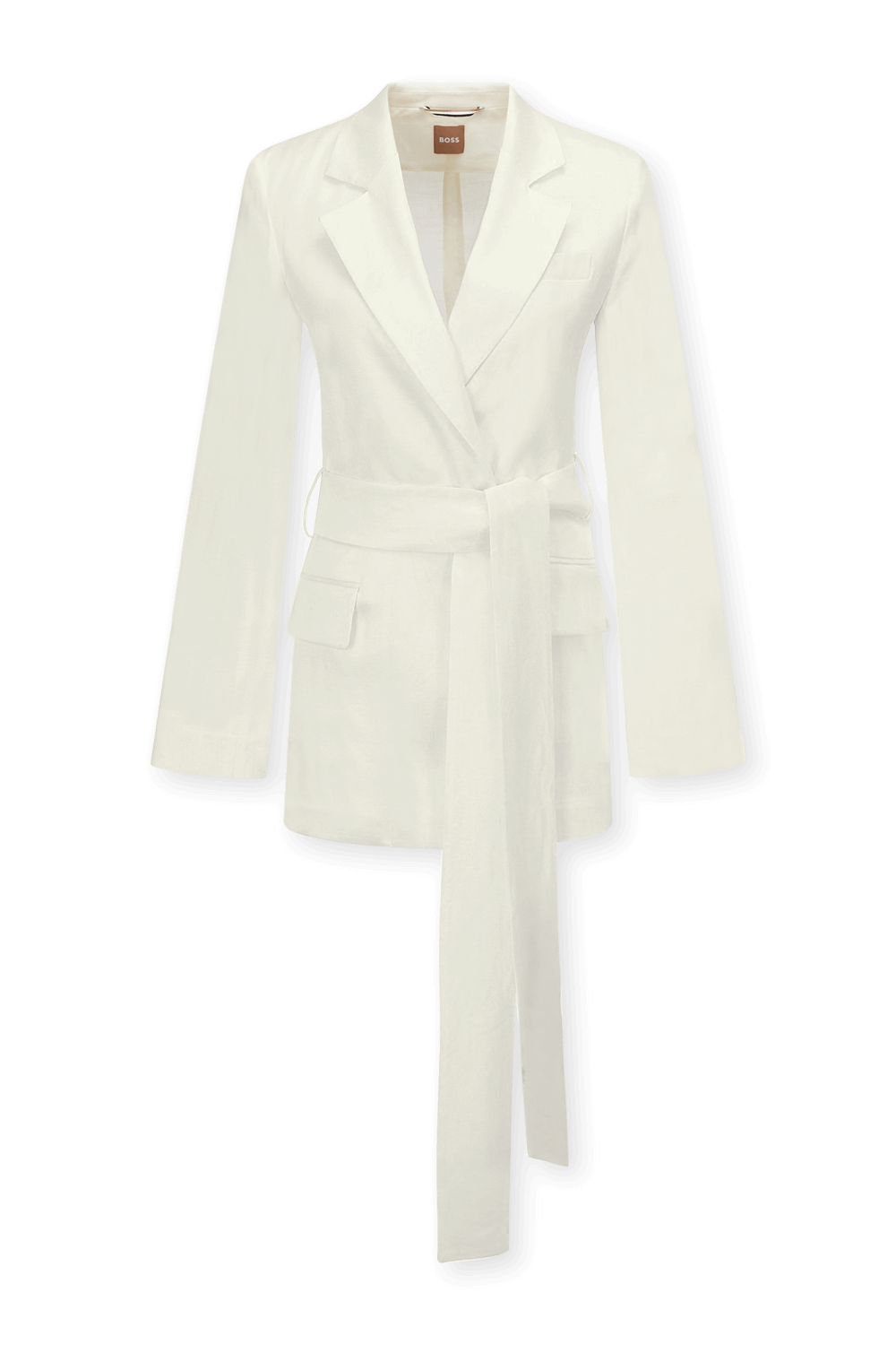 ז`קט מבית המותג Hugo Boss. זהו דגם העשוי תערובת ויסקוזה וצמר איכותית בגוון לבן. לפריט גזרה מחמיאה עם דגש בקו המתניים באמצעות קשירה לצד כתפיות דומיננטיות וצאוורון משולשים. מדובר בפיס סופר אלגנטי אותו שיעניק לוק מהודק ועתיר גלאם.