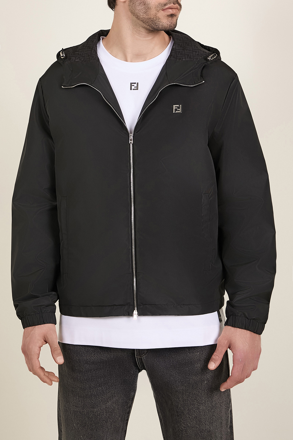 ז'קט בומבר קל מבית Fendi עם קפוצ'ון, עשוי ניילון בצבע שחור ומושלם לעונות המעבר. יש לו בטנה כהה בדוגמת FF והוא נסגר ברוכסן.
