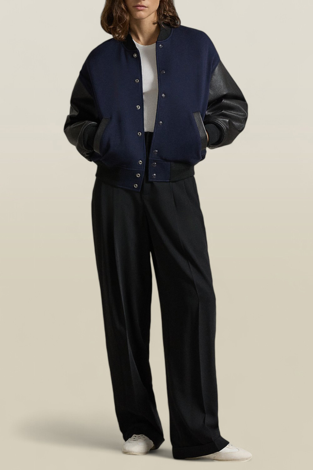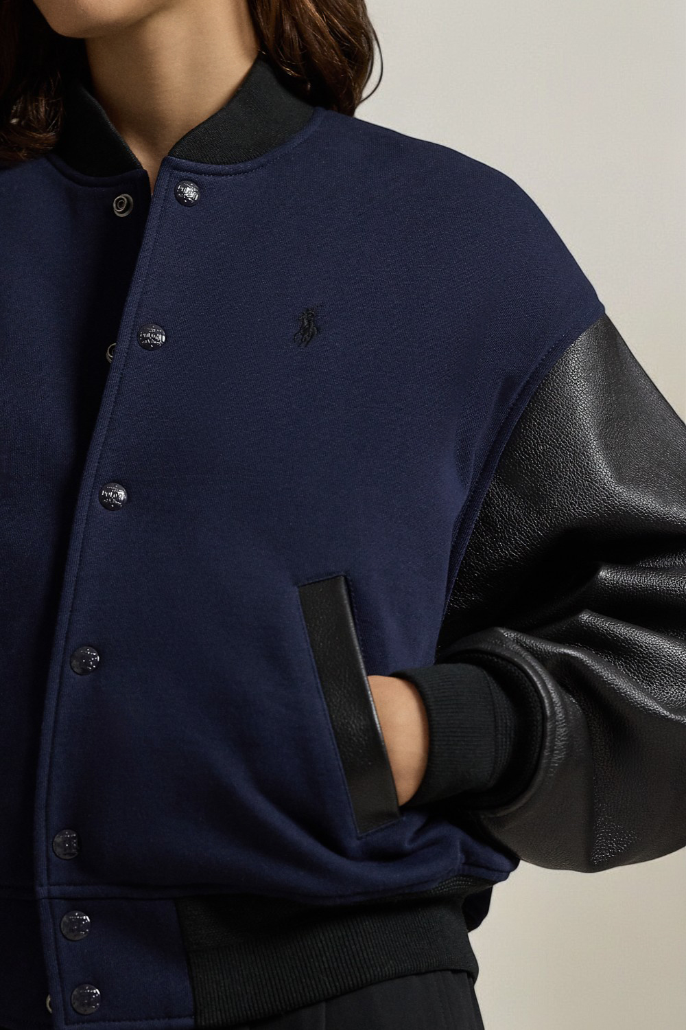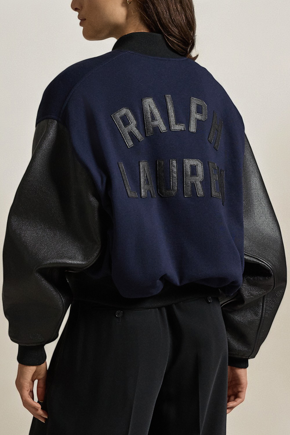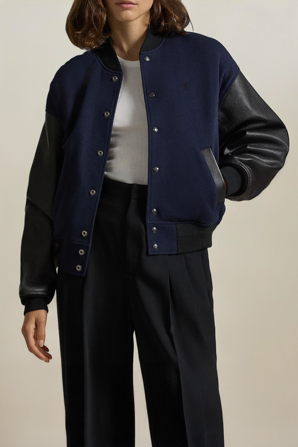 ז'קט בומבר מרשים מבית Polo Ralph Lauren. הוא עשוי כותנה בצבע כחול כהה, עם ביטנת סאטן קווילט בצבע שחור ובמילוי קל ומחמם. יש לו שרוולי עור שחורים, ובצידו האחורי משולב שם המותג באותיות פאץ' העשויות עור שחור. נסגר בכפתורי תיק תק.