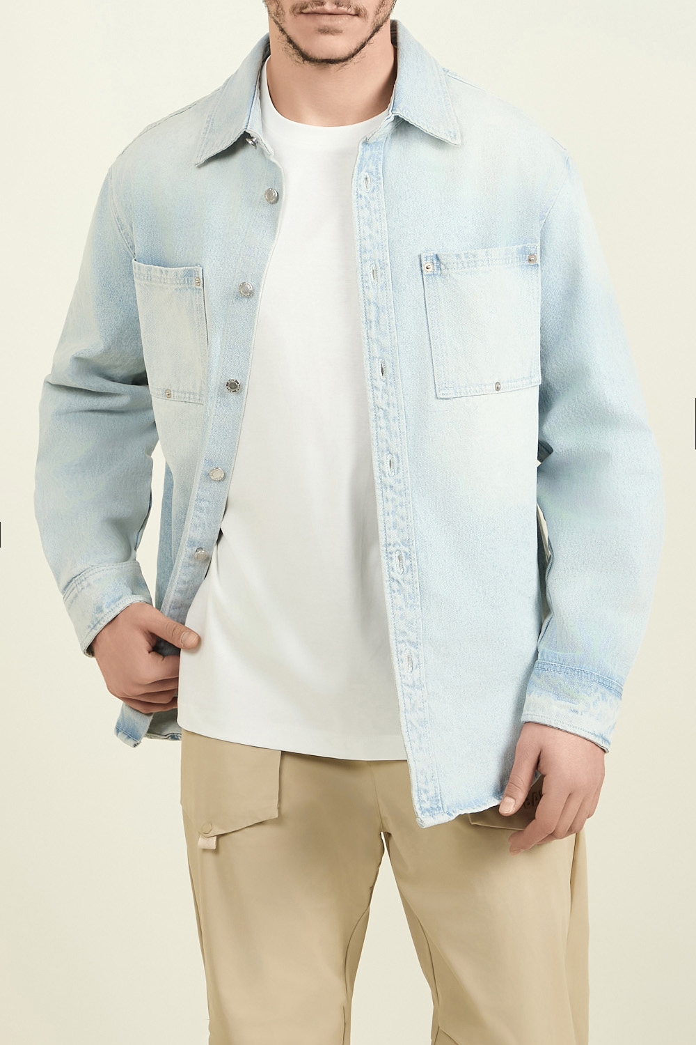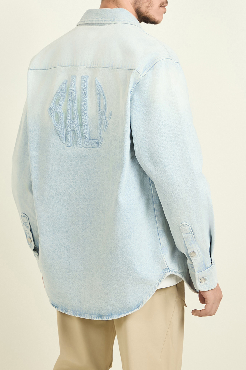 ז'קט ג'ינס מבית Balr, עשוי תערובת כותנת דנים ופוליאסטר בצבע תכלת בשילוב כפתורים כסופים עם שני כיסי חזה ורקמת לוגו המותג בגב. ניתן ללבוש את החולצה כמכופתרת, או בפתיחת הכפתורים כז'קט.