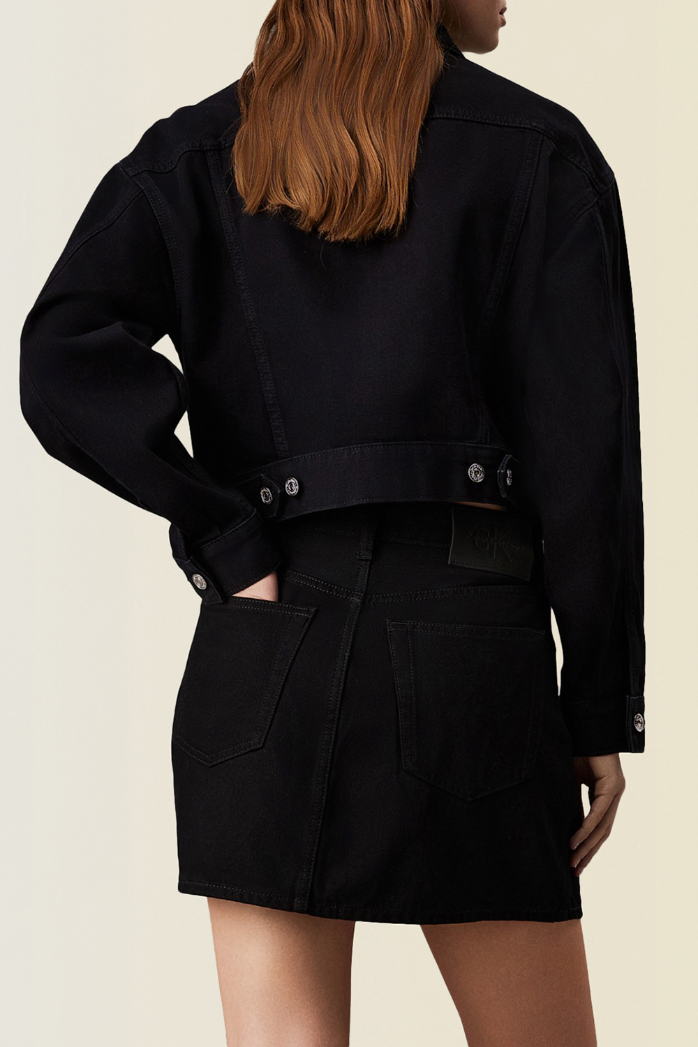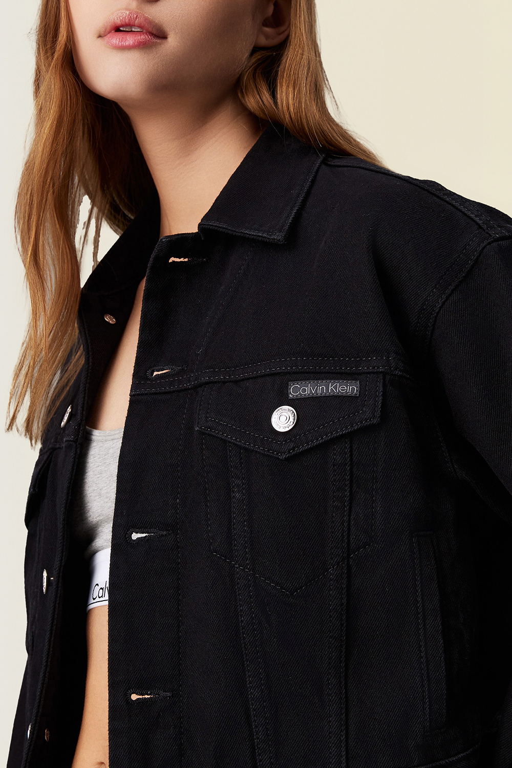 ז'קט ג'ינס Trucker מבית Calvin Klein, עשוי כותנת דנים מחודשת בצבע שחור ובגזרת קרופ בהשראת שנות ה-90