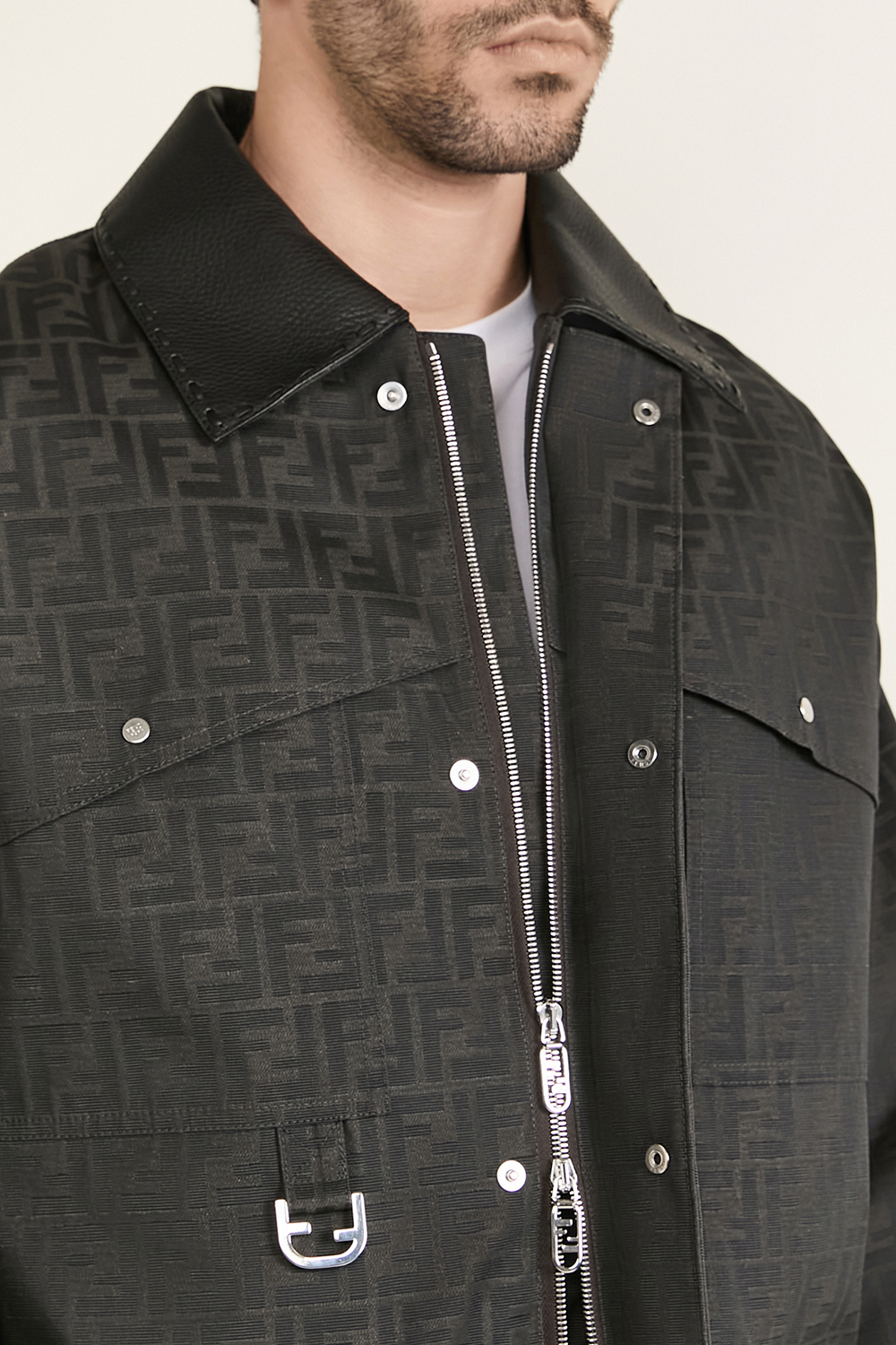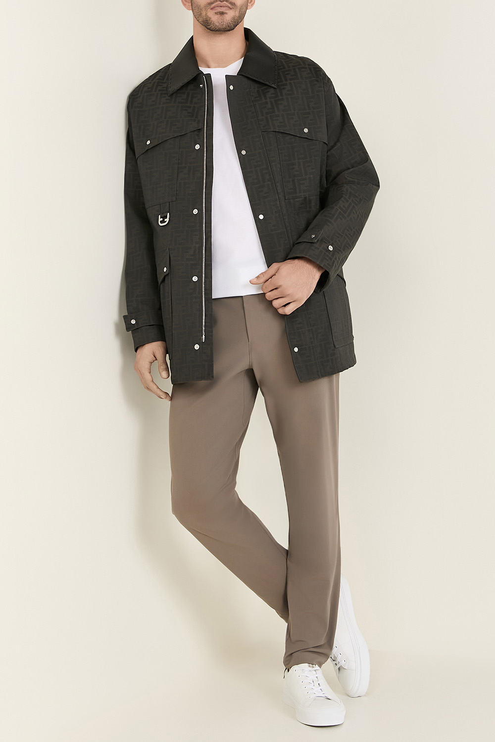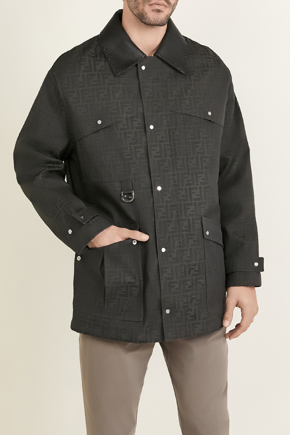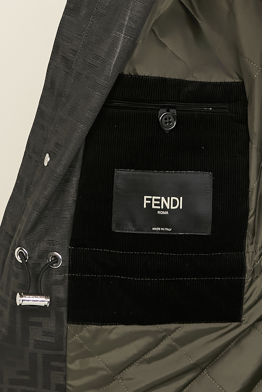 ז'קט מיוחד מבית Fendi בגזרה משוחררת, תוצרת איטליה. הוא עשוי קנבס מצופה שעווה בצבע חום ובאריגת ג'קרד המשלבת את לוגו ה-FF, עם ביטנת סאטן קווילט בצבע ירוק ובריפוד קל. דיטיילים מעוצבים רבים יהפכו אותו לפריט יחודי במלתחה שלכם - ארבעה כיסי אוברסייז מקדימה הנסגרים בכפתורי תיק תק, שרוך גומי פנימי המאפשר להצר אותו באזור המותניים, כיס פנימי בעיצוב קורדרוי ובסגירת כפתור וצווארון עור. הז'קט נסגר ברוכסן ובכפתורי תיק תק.