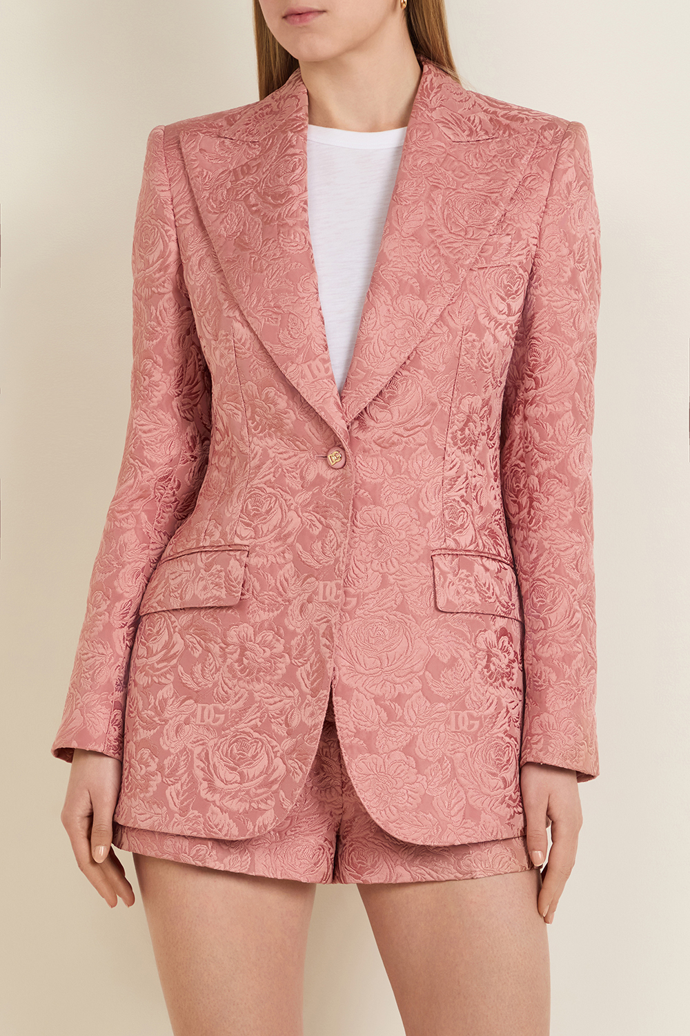 ז'קט ג'קרד בעיצוב Dolce&Gabbana, עשוי כותנה ומשי באריגת ג'קרד בצבע ורוד בשילוב דוגמת פרחים. יש לו בטנה מסאטן משי והוא נסגר בכפתור DG מעוצב. שלבו אותו עם מכנסיים קצרים תואמים לקבלת חליפה מושלמת.