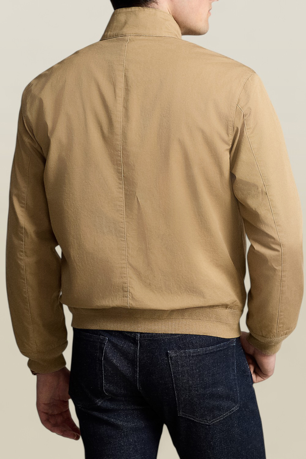 ז'קט כותנה בגזרה ישרה מבית Polo Ralph Lauren, עשוי כותנה בצבע בז' עם ביטנה משובצת בצבע ירוק. יש לו כיס פנימי ושני כיסי צד הנסגרים בכפתור והוא נסגר ברוכסן.