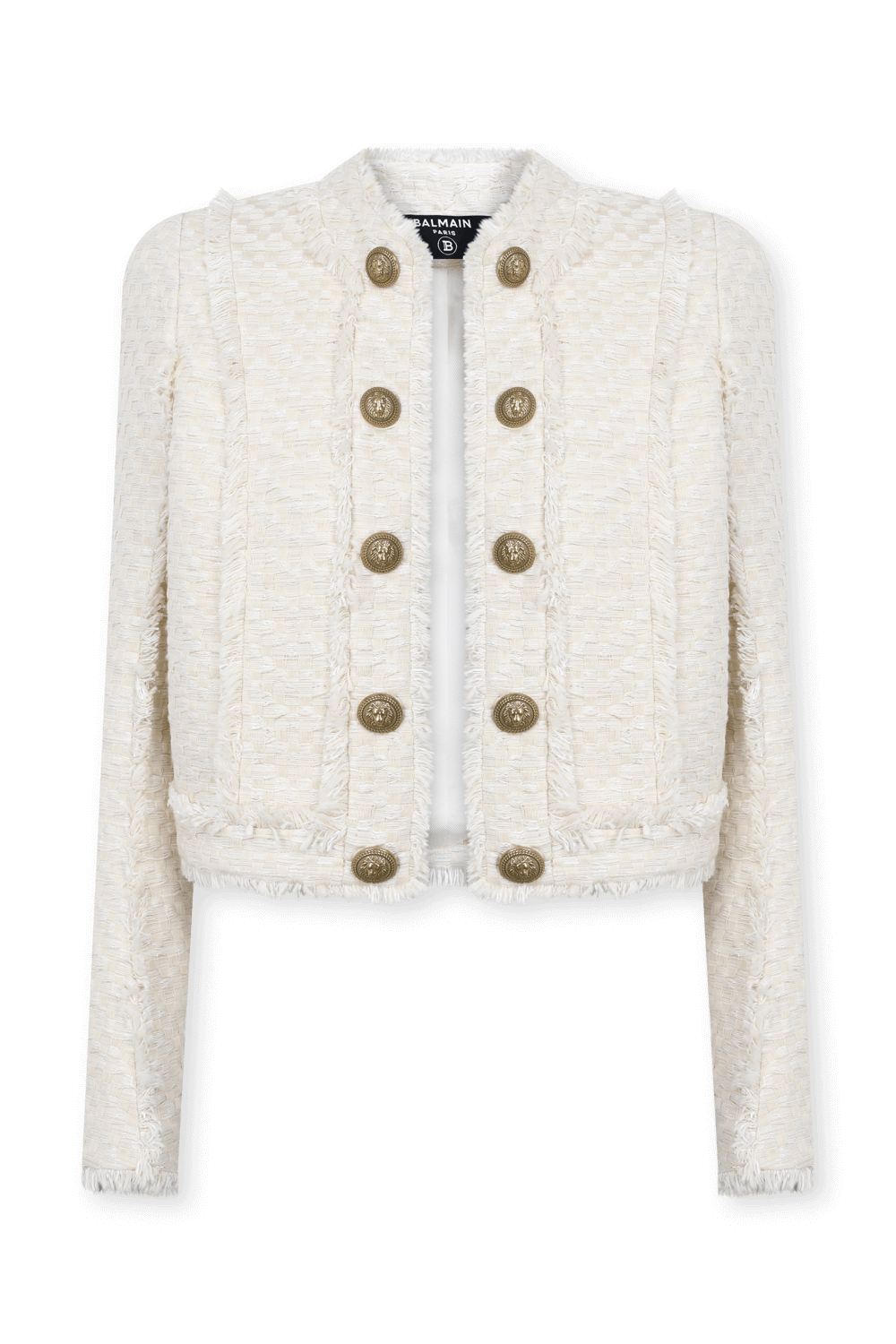 ז'קט בעיצוב בית האופנה הצרפתי Balmain, העשוי תערובת כותנה וויסקוזה בגוון לבן, ומציג גזרת קרופ בעלת עיצוב סרוג וקלאסי הכולל כתפיים משורטטות ושרוולים ארוכים. לפריט רכיסת כפתורים מוזהבים הנושאים את שם המותג, לצד תיפורי שתי וערב עדינים וגימורי פרנזים.