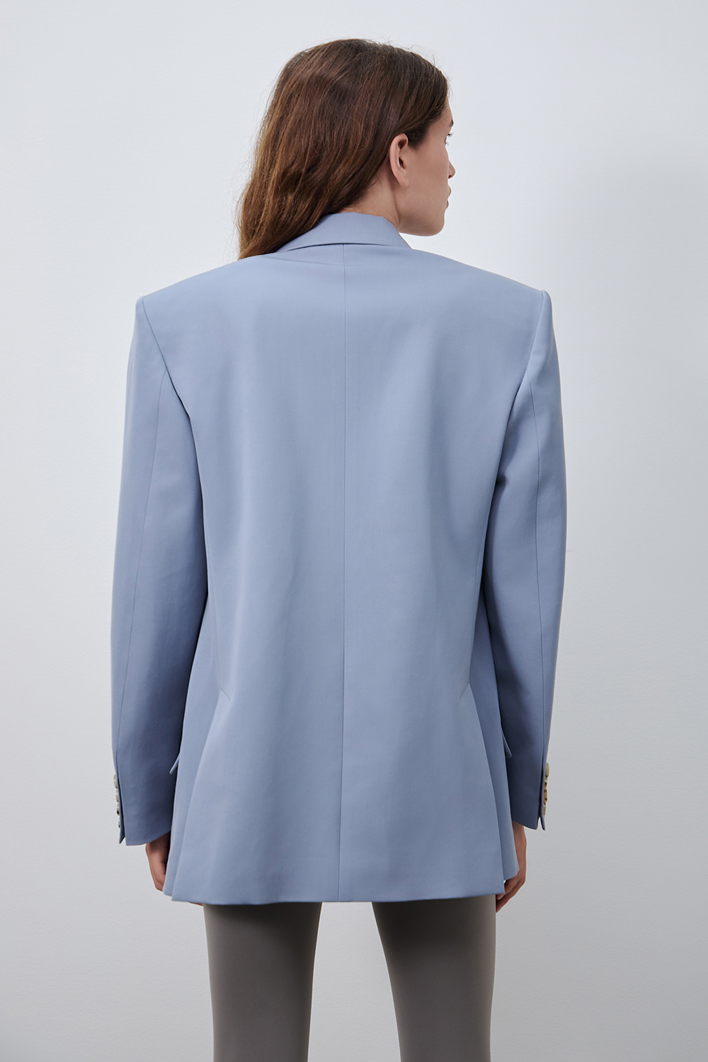 ז'קט מחוייט בגזרת אוברסייז מבית Stella Mccartney, עשוי ויסקוזה וכותנה בצבע אפור. נסגר בכפתורים ברכיסה כפולה.